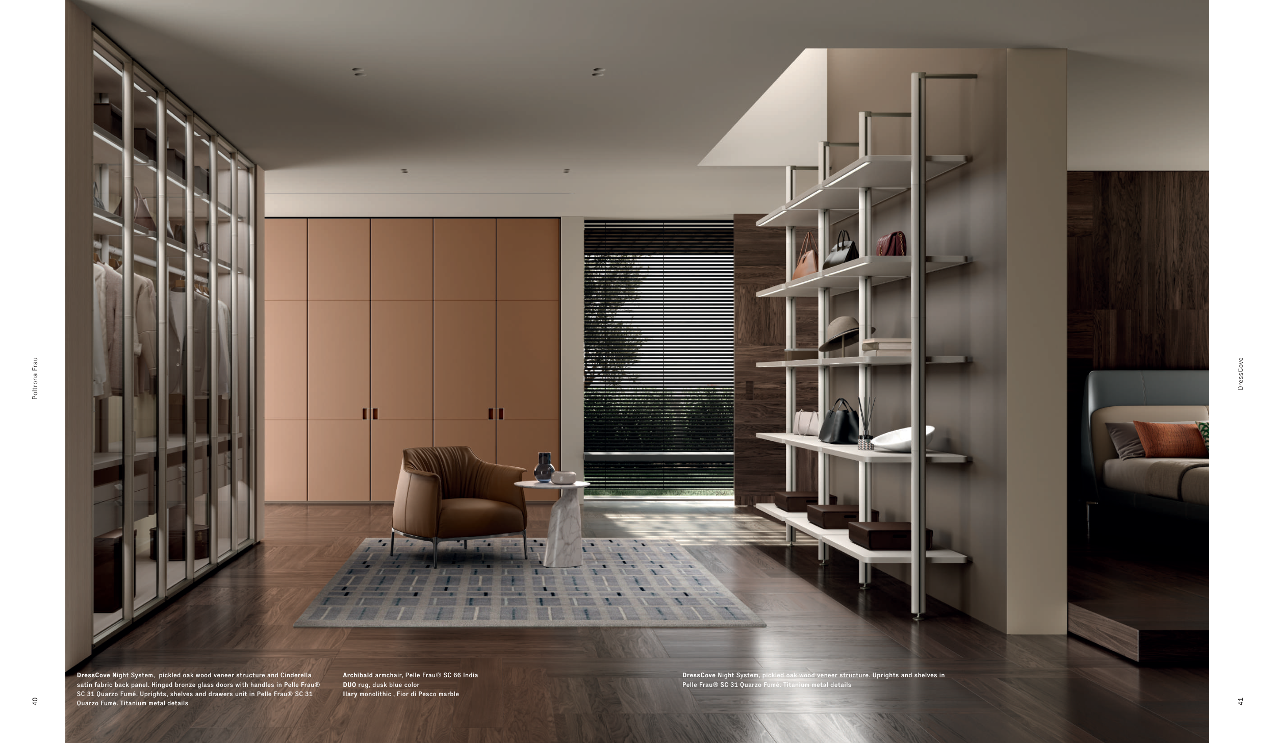 satin fabric back panel. Hinged bronze glass doors with handles in Pelle Frau®
