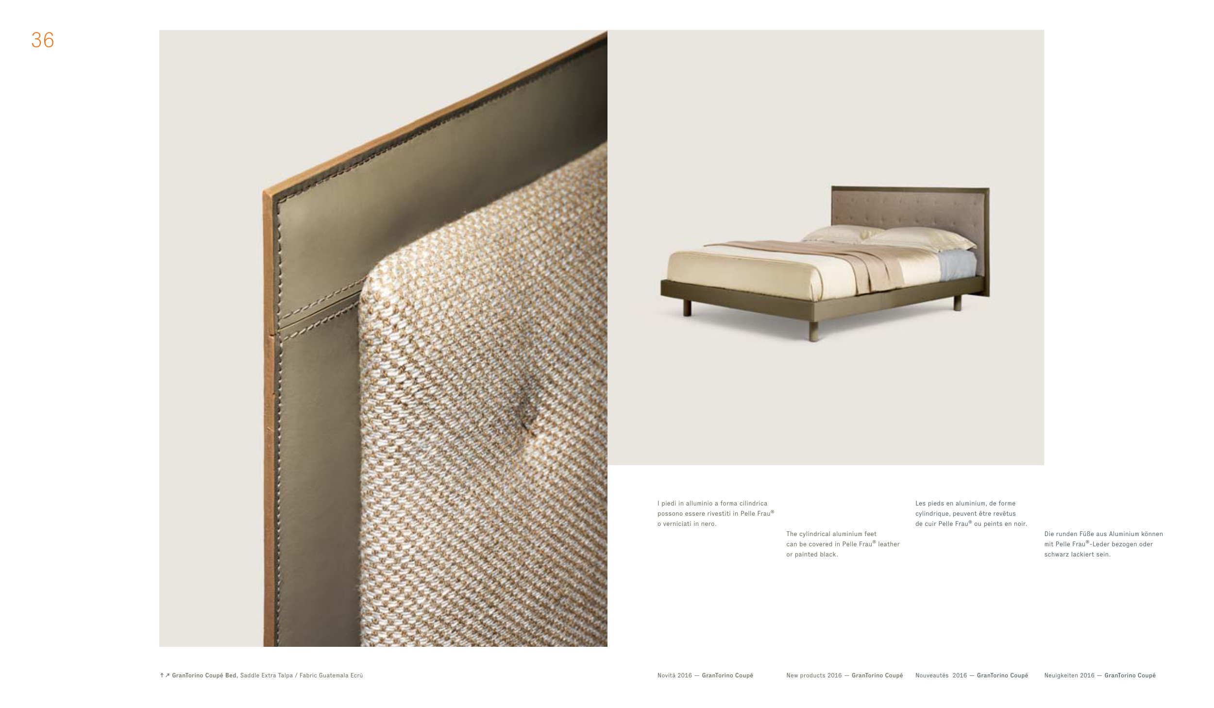 ↑↗ GranTorino Coupé Bed, Saddle Extra Talpa / Fabric Guatemala Ecrù