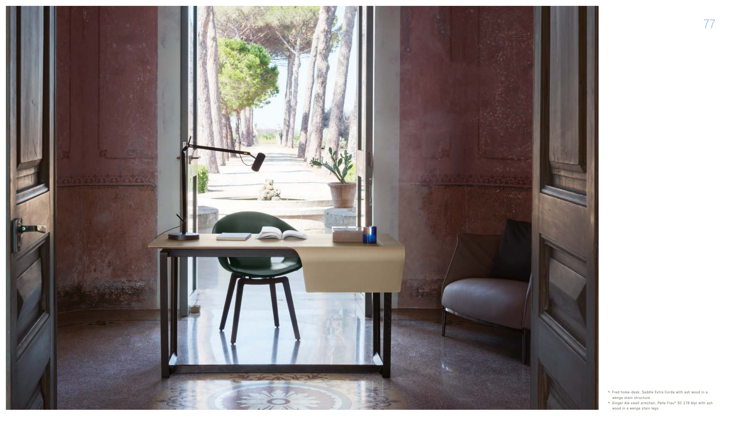 77 ↖ Fred home-desk, Saddle Extra Corda with ash wood in a wenge stain structure ↖ Ginger Ale small armchair, Pelle Frau® SC 178 Alpi with ash wood in a wenge stain legs