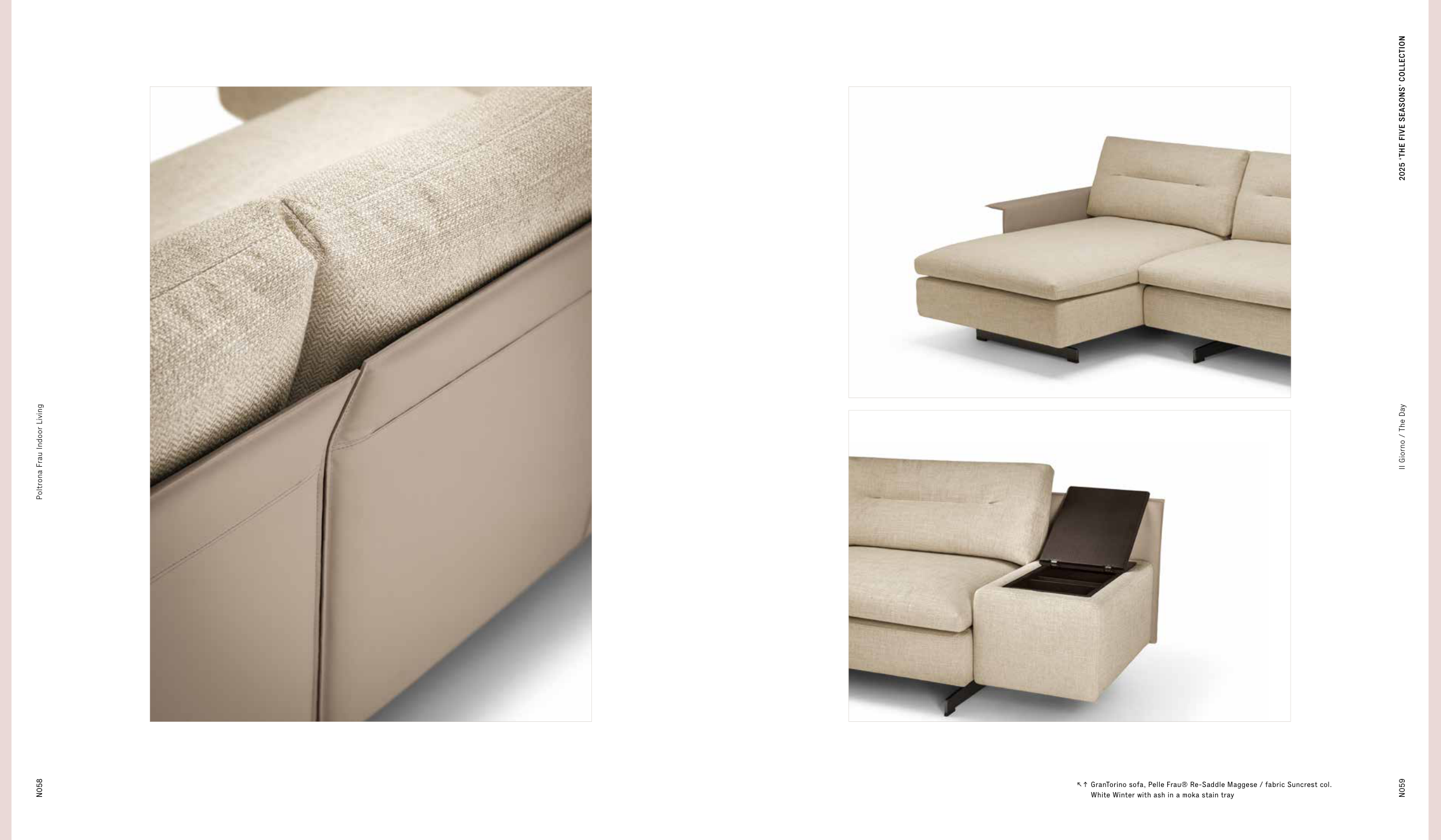 ↖↑ GranTorino sofa, Pelle Frau® Re-Saddle Maggese / fabric Suncrest col. White Winter with ash in a moka stain tray N059 Il Giorno / The Day N058 Poltrona Frau Indoor Living 2025 ‘THE FIVE SEASONS’ COLLECTION