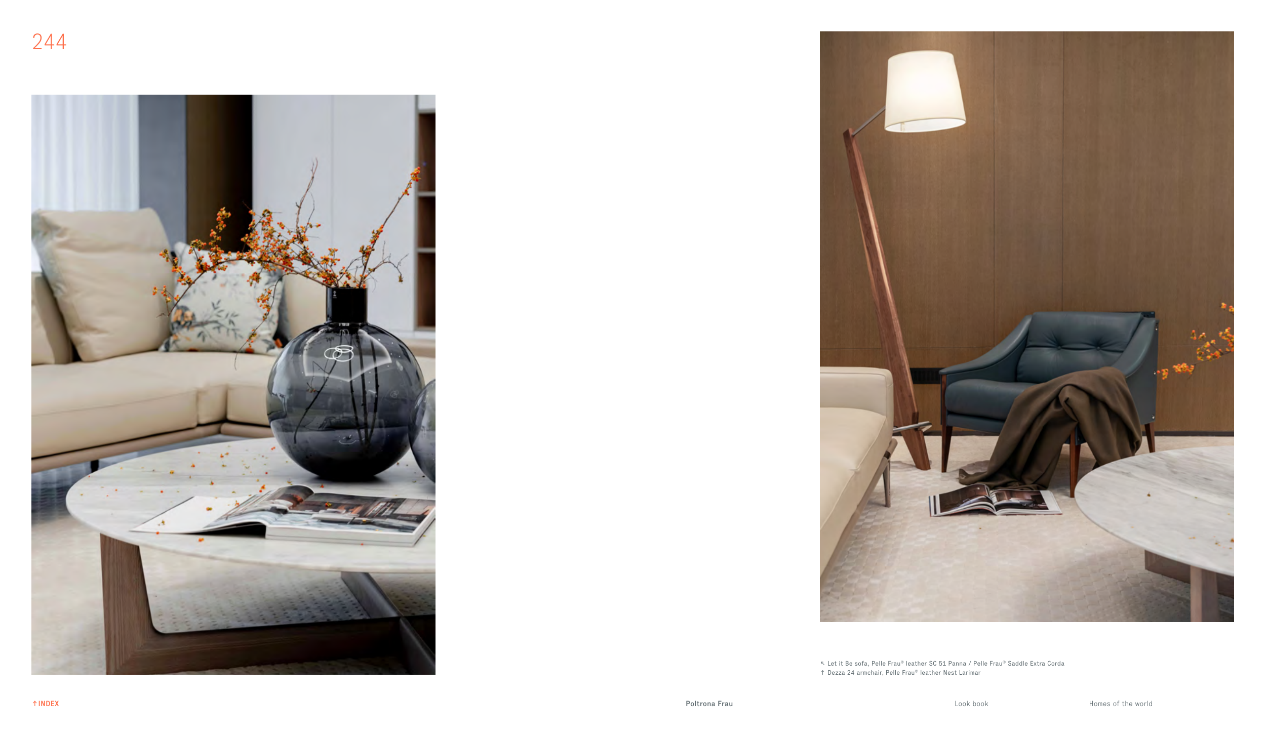 244 ↖ Let it Be sofa, Pelle Frau® leather SC 51 Panna / Pelle Frau® Saddle Extra Corda ↑ Dezza 24 armchair, Pelle Frau® leather Nest Larimar Look book Homes of the world Poltrona Frau ↑INDEX