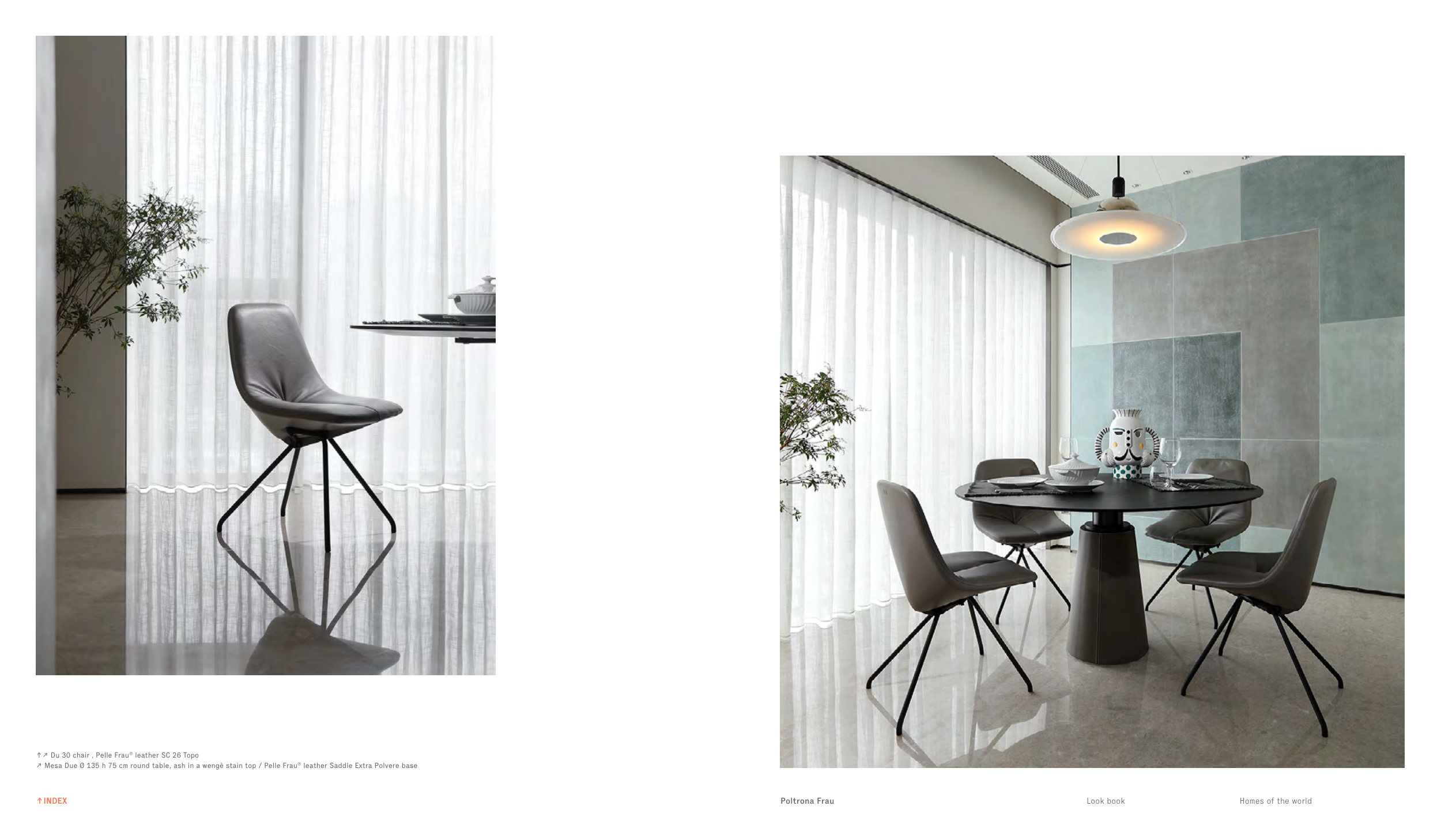 278 ↑↗ Du 30 chair , Pelle Frau® leather SC 26 Topo ↗ Mesa Due Ø 135 h 75 cm round table, ash in a wengè stain top / Pelle Frau® leather Saddle Extra Polvere base Look book Homes of the world Poltrona Frau ↑INDEX