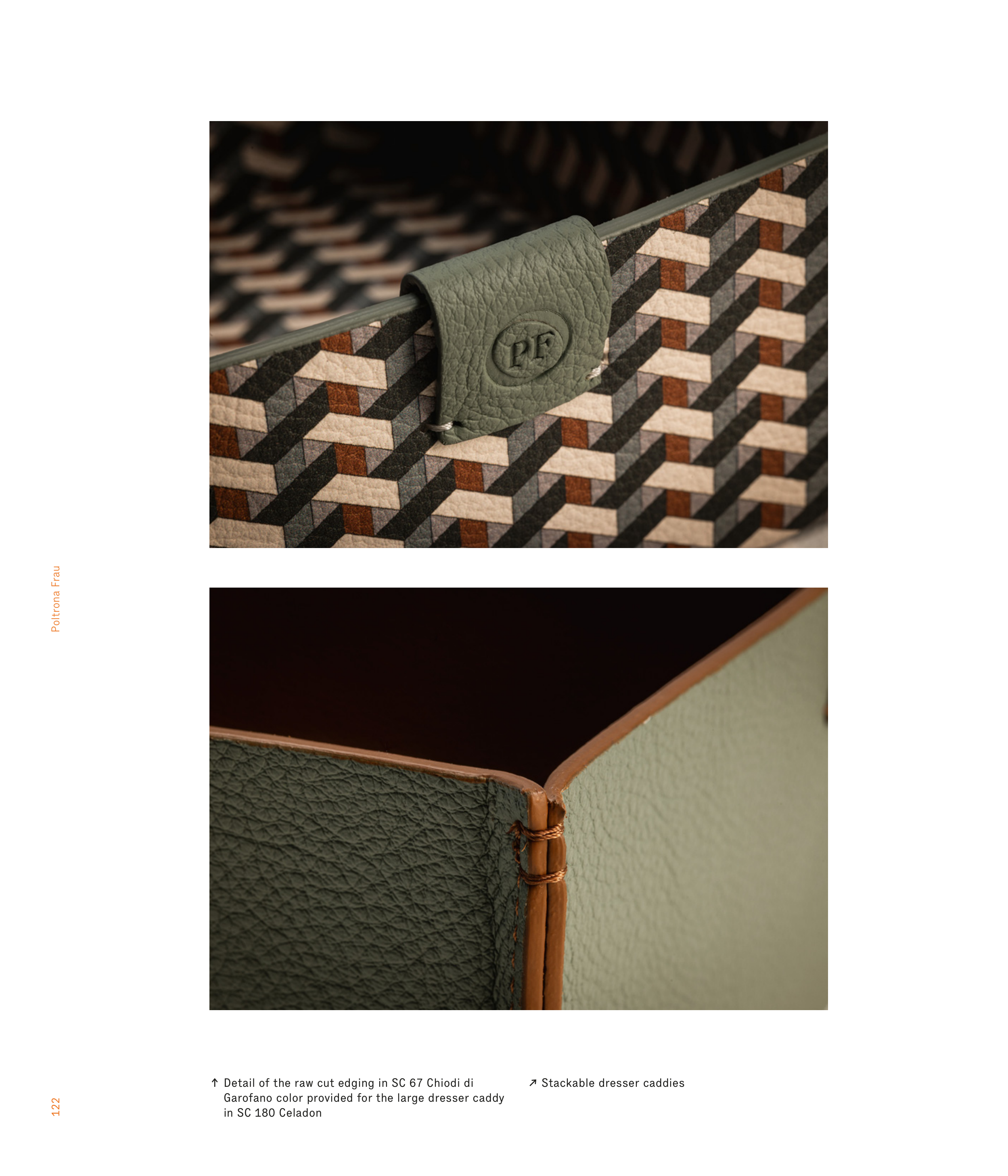122 Poltrona Frau ↑ Detail of the raw cut edging in SC 67 Chiodi di Garofano color provided for the large dresser caddy in SC 180 Celadon ↗ Stackable dresser caddies