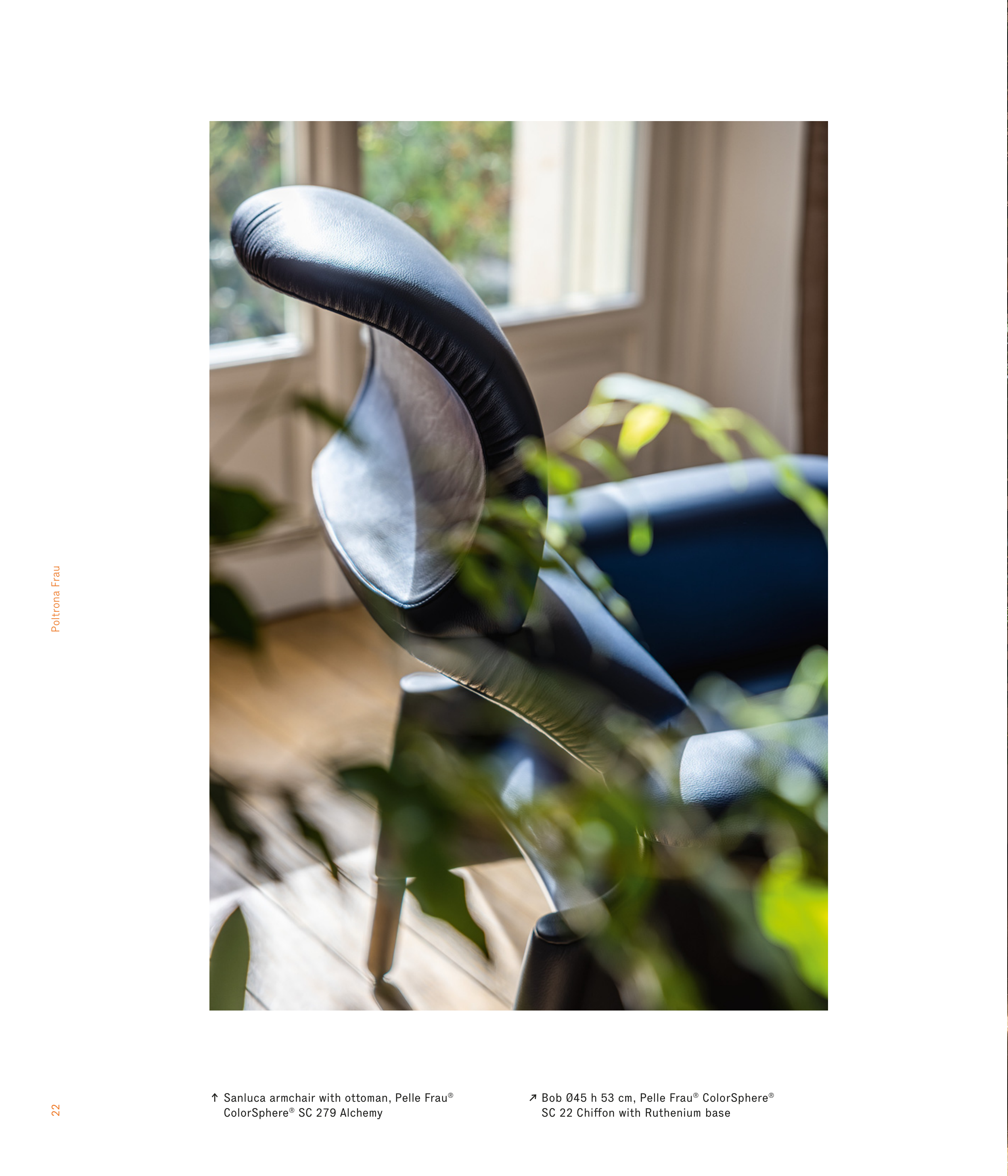 22 Poltrona Frau ↗ Bob Ø45 h 53 cm, Pelle Frau® ColorSphere® SC 22 Chiff on with Ruthenium base ↑ Sanluca armchair with ottoman, Pelle Frau® ColorSphere® SC 279 Alchemy