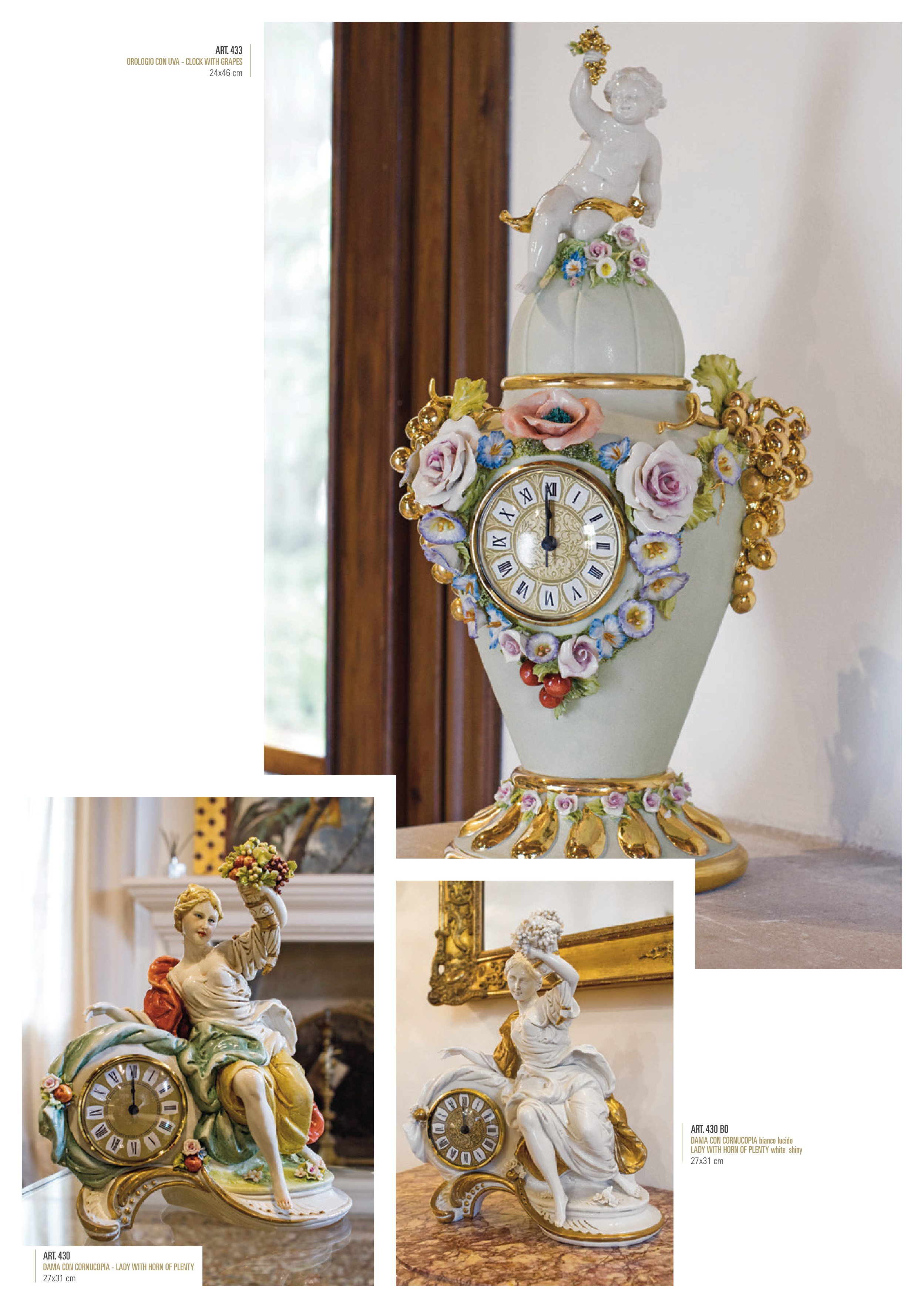 ART. 433 OROLOGIO CON UVA - CLOCK WITH GRAPES 24x46 cm ART. 430 DAMA CON CORNUCOPIA - LADY WITH HORN OF PLENTY 27x31 cm ART. 430 BO DAMA CON CORNUCOPIA bianco lucido LADY WITH HORN OF PLENTY white shiny 27x31 cm