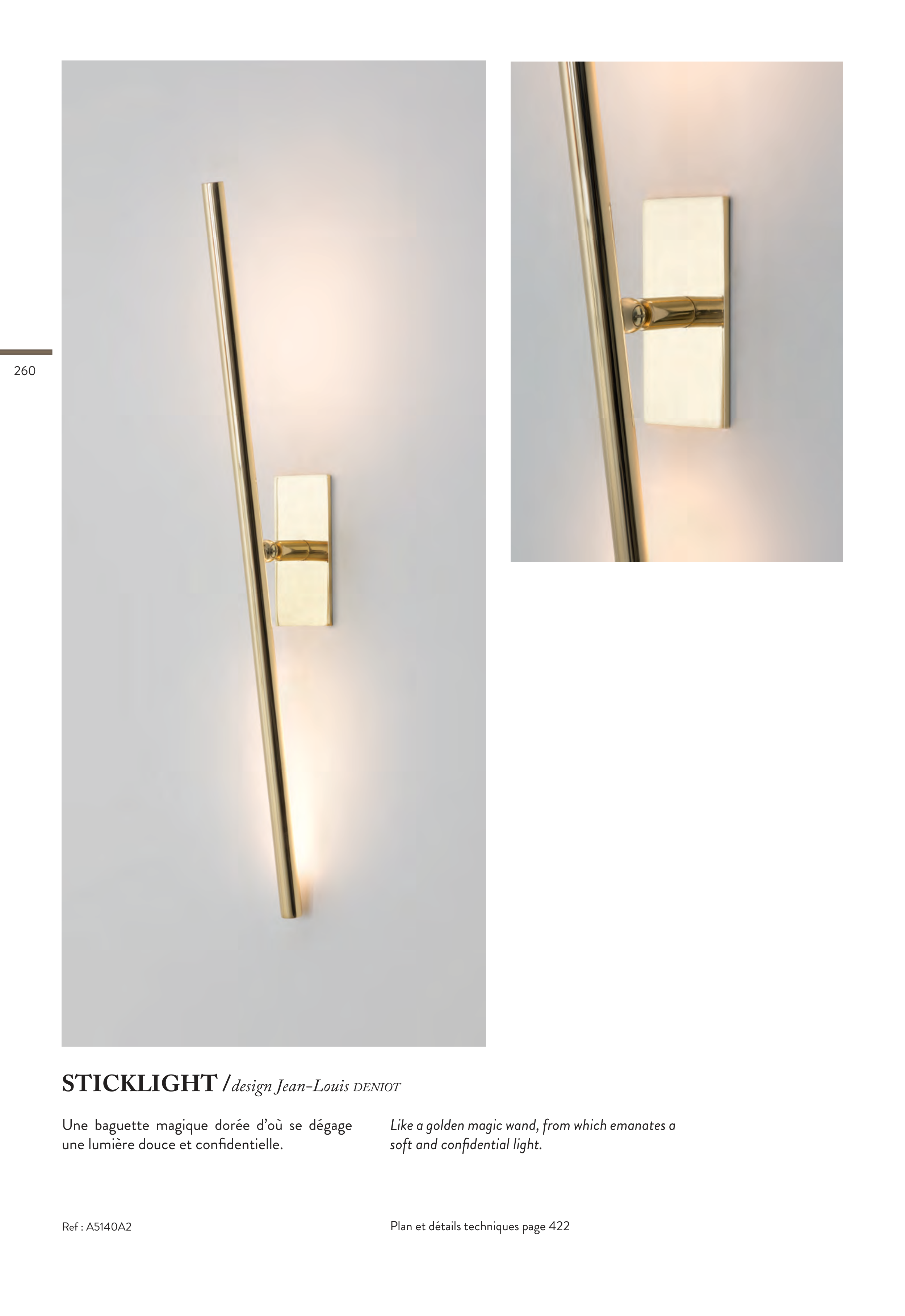 STICKLIGHT /design Jean-Louis deniot Ref : A5140A2 Plan et détails techniques page 422 Une baguette magique dorée d’où se dégage une lumière douce et confidentielle. Like a golden magic wand, from which emanates a soft and confidential light. 260