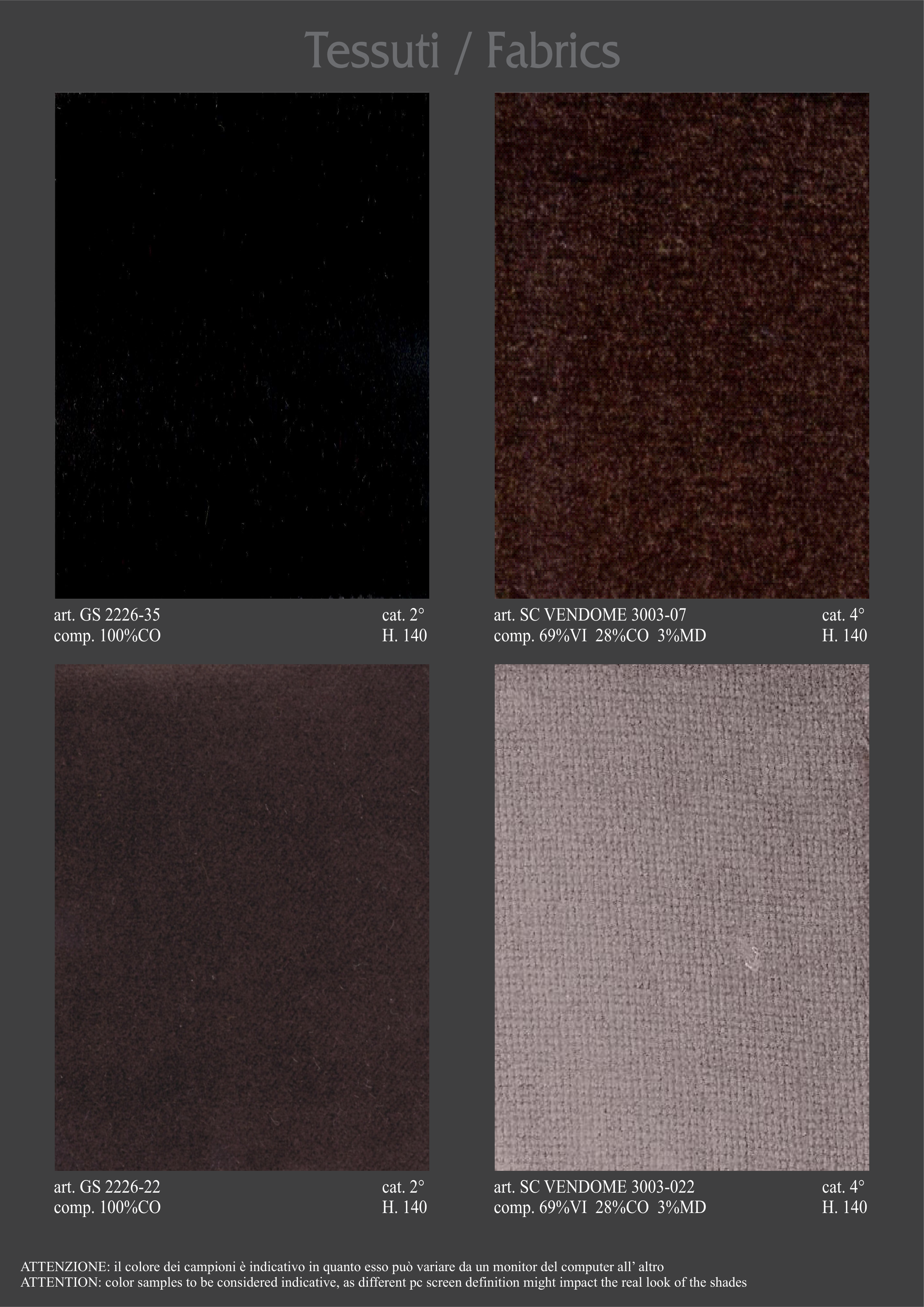 ATTENTION: color samples to be considered indicative, as different pc screen definition might impact the real look of the shades