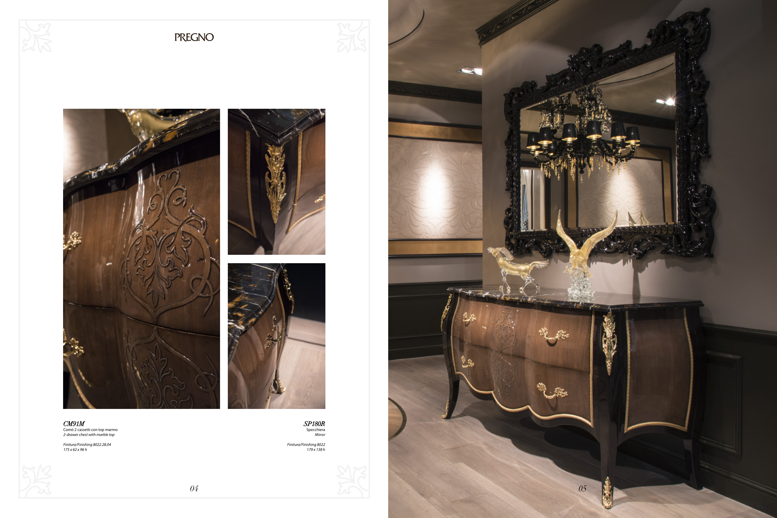 CM91M Comò 2 cassetti con top marmo 2-drawer chest with marble top Finitura/Finishing 8022.28.04 175 x 62 x 96 h 04 05 SP180R Specchiera Mirror Finitura/Finishing 8022 179 x 138 h