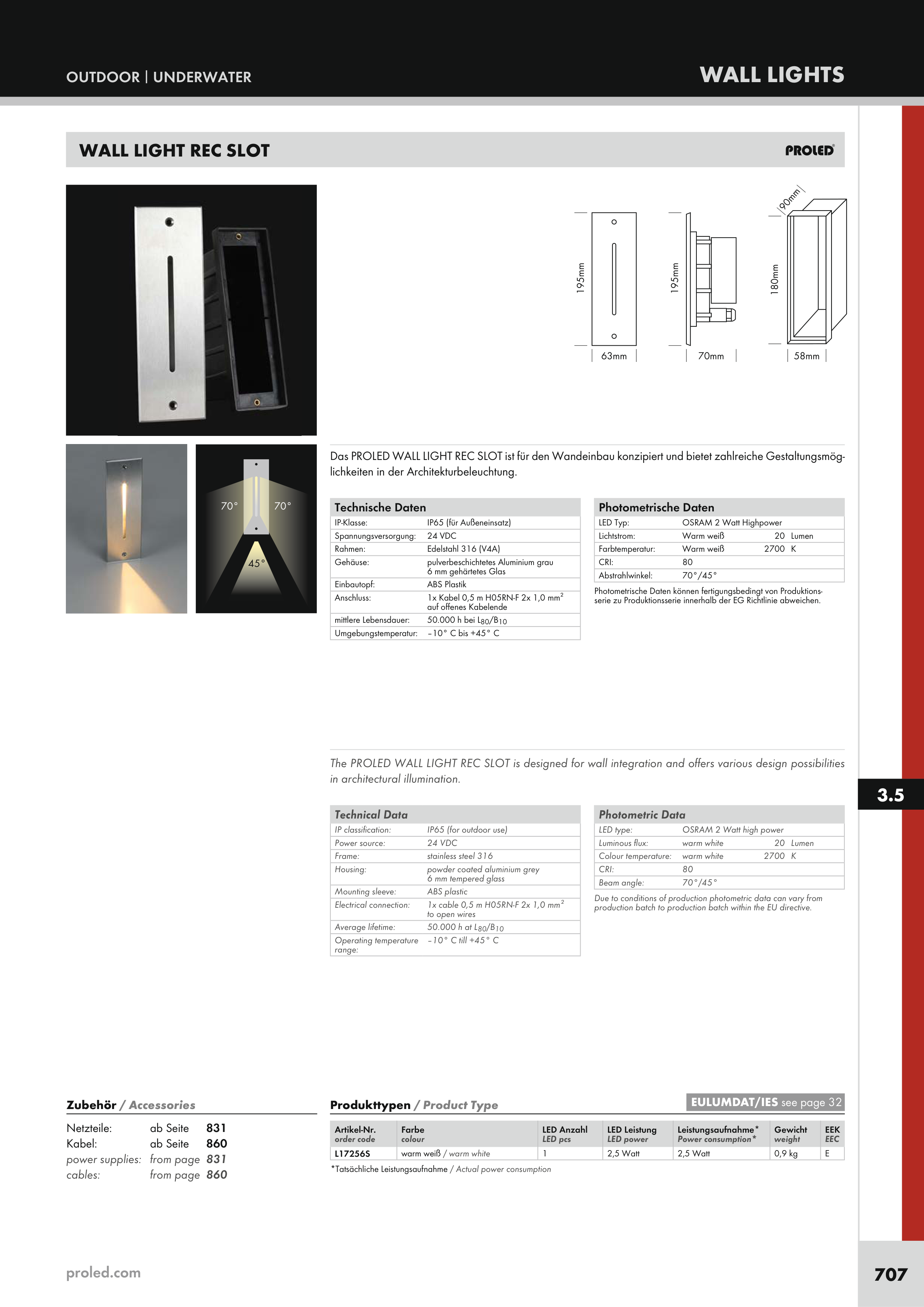 The PROLED WALL LIGHT REC SLOT is designed for wall integration and offers various design possibilities