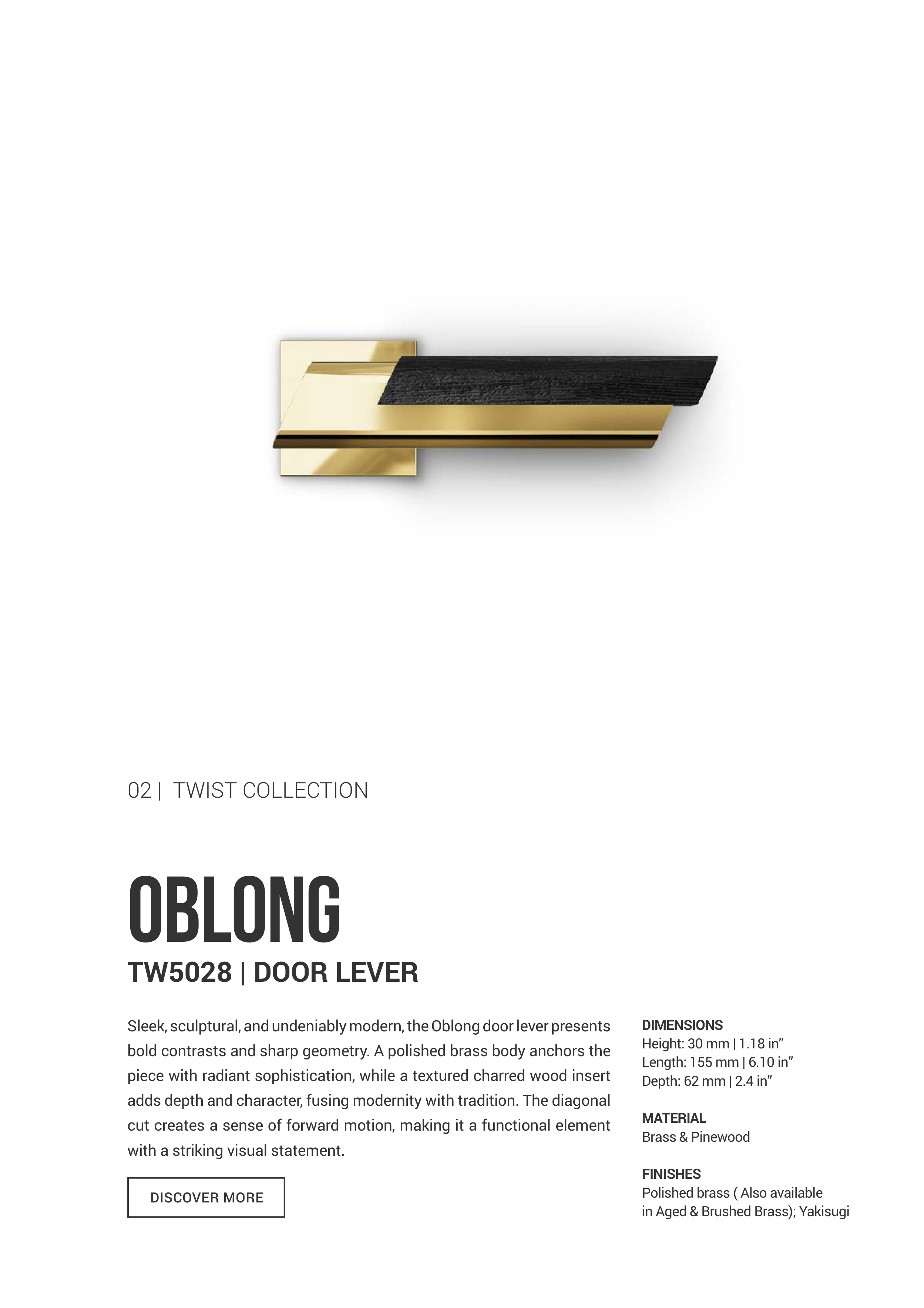 bold contrasts and sharp geometry. A polished brass body anchors the