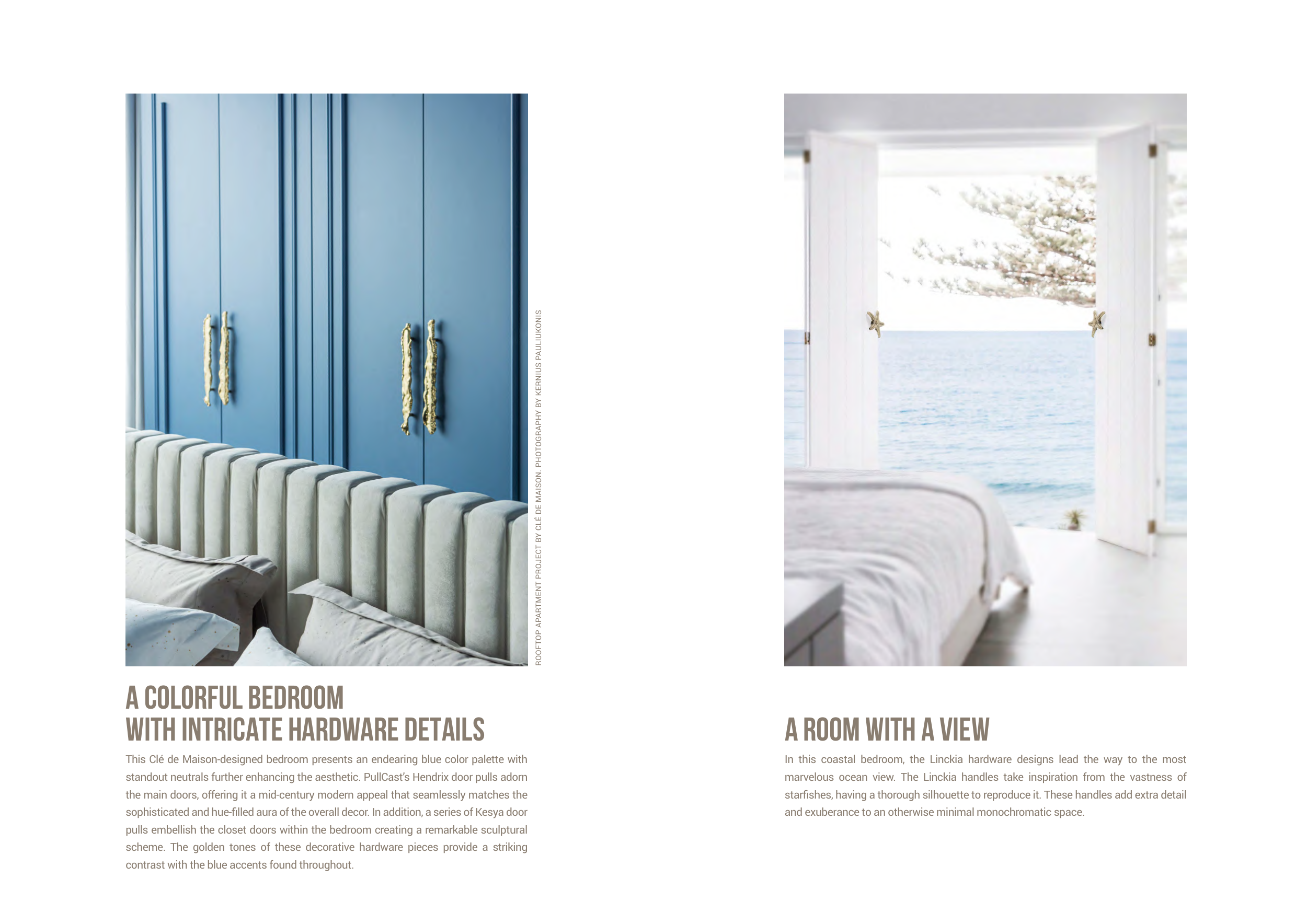 In this coastal bedroom, the Linckia hardware designs lead the way to the most