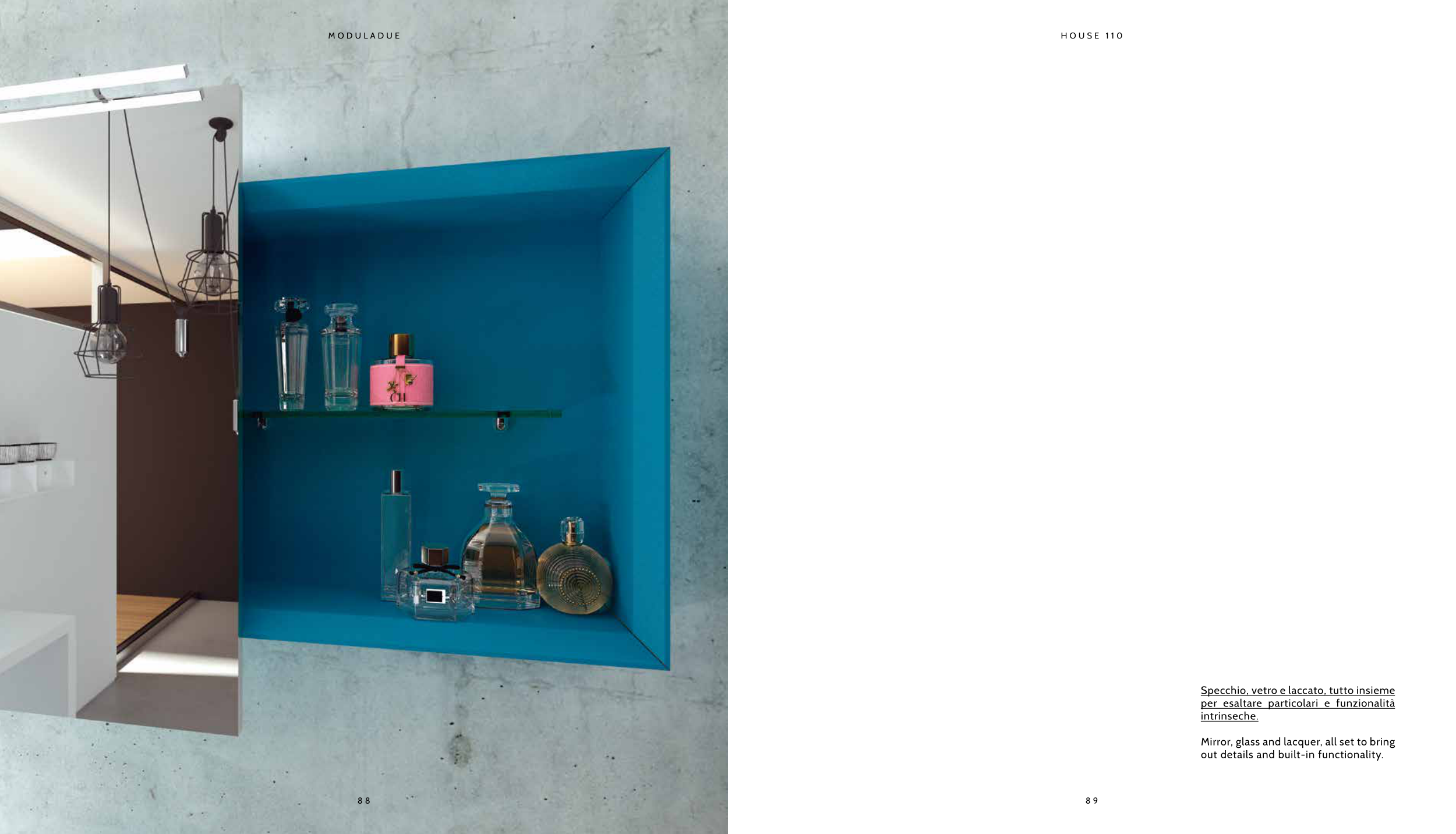 H O U S E 1 1 0 Specchio, vetro e laccato, tutto insieme per esaltare particolari e funzionalità intrinseche. Mirror, glass and lacquer, all set to bring out details and built-in functionality. M O D U L A D U E 8 9 8 8