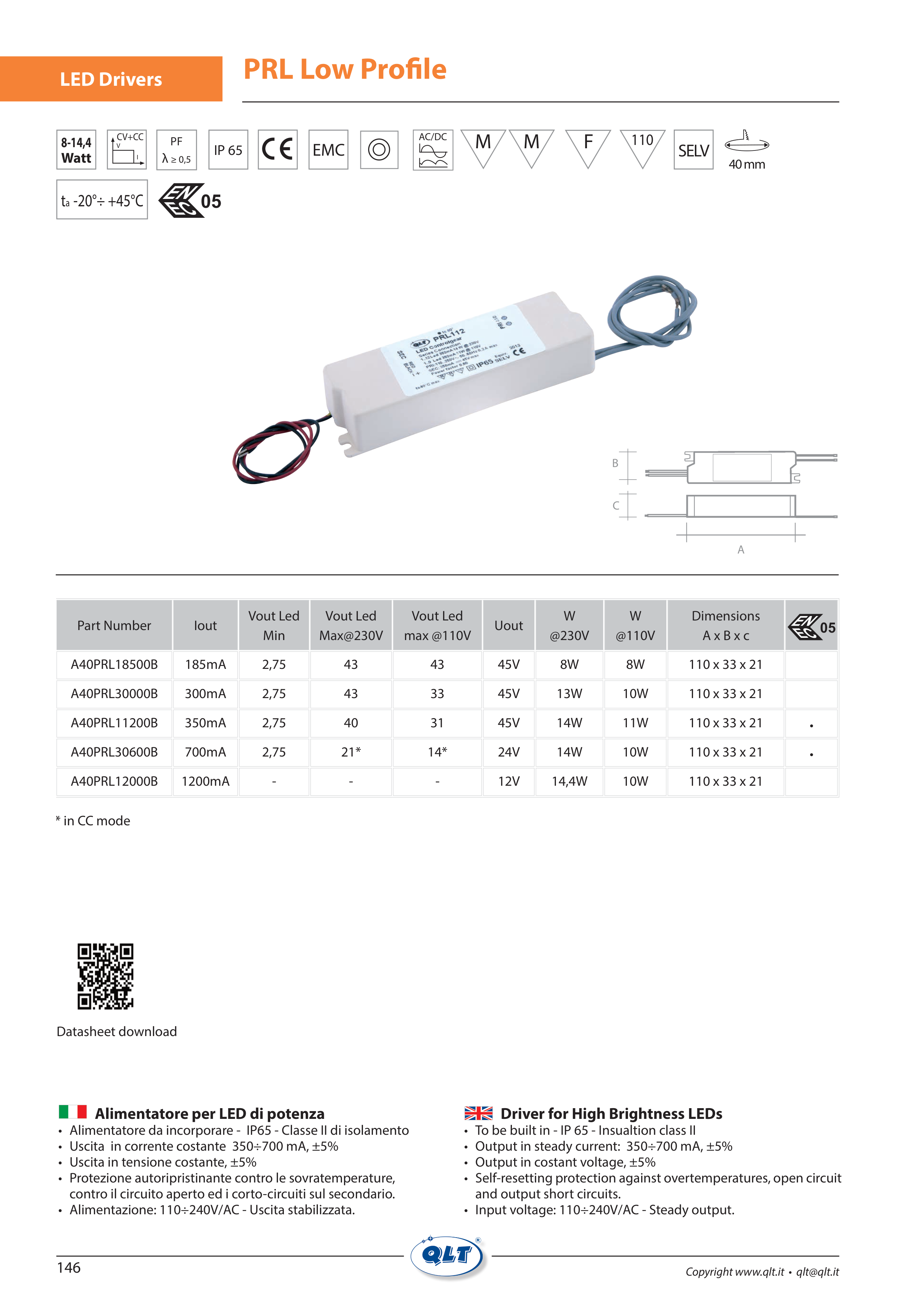 • To be built in - IP 65 - Insualtion class II