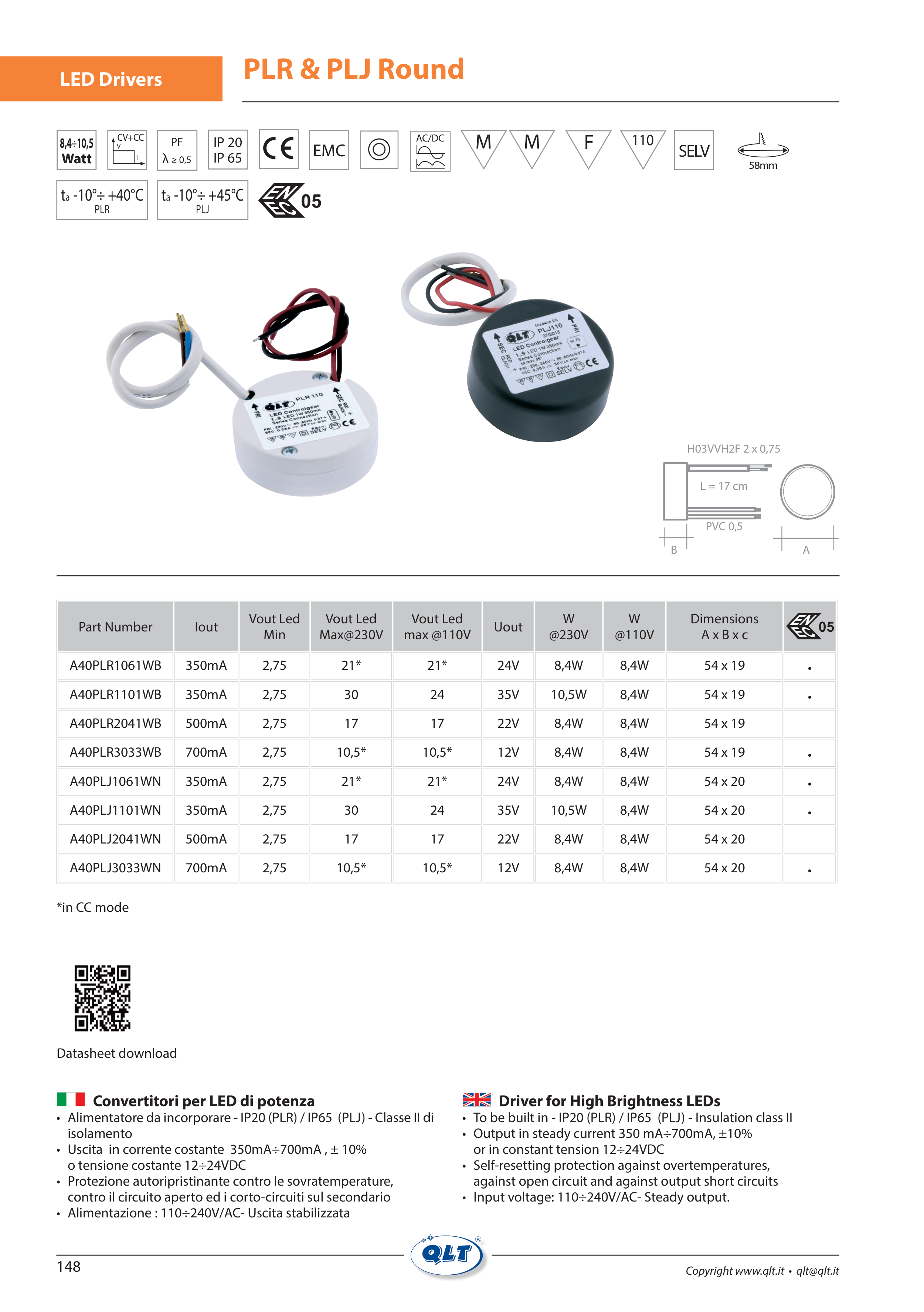 • To be built in - IP20 (PLR) / IP65 (PLJ) - Insulation class II