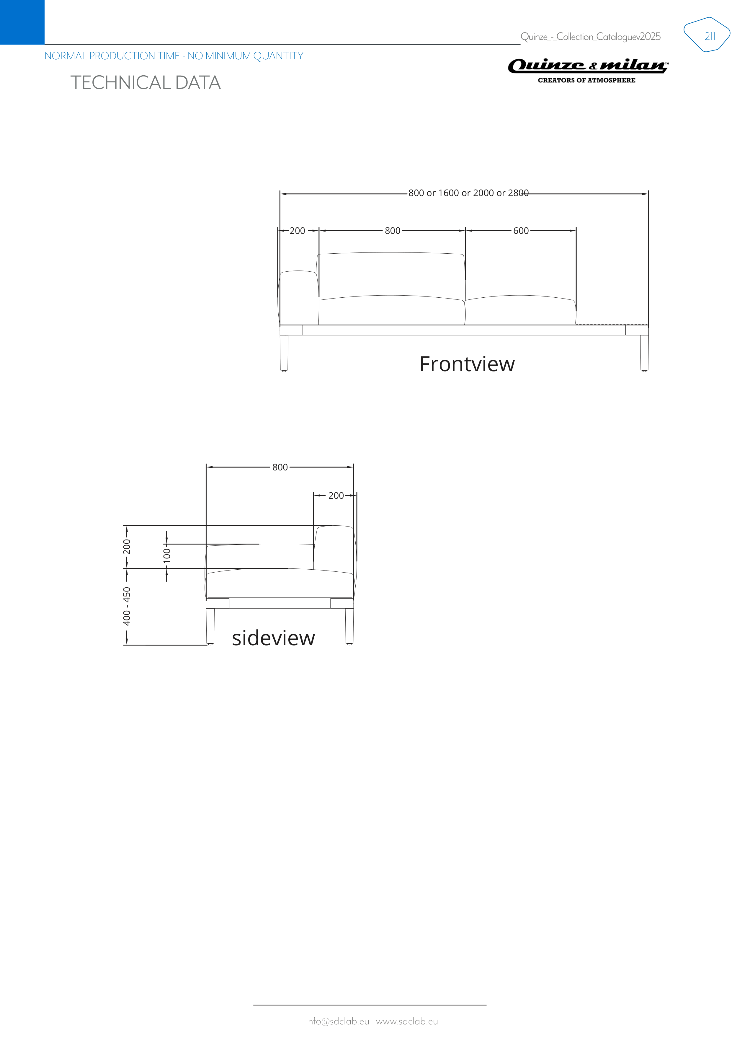 info@sdclab.eu www.sdclab.eu 211 Quinze_-_Collection_Catalogue v2025 NORMAL PRODUCTION TIME - NO MINIMUM QUANTITY TECHNICAL DATA 800 200 400 - 450 200 100 600 800 200 800 or 1600 or 2000 or 2800 sideview Frontview