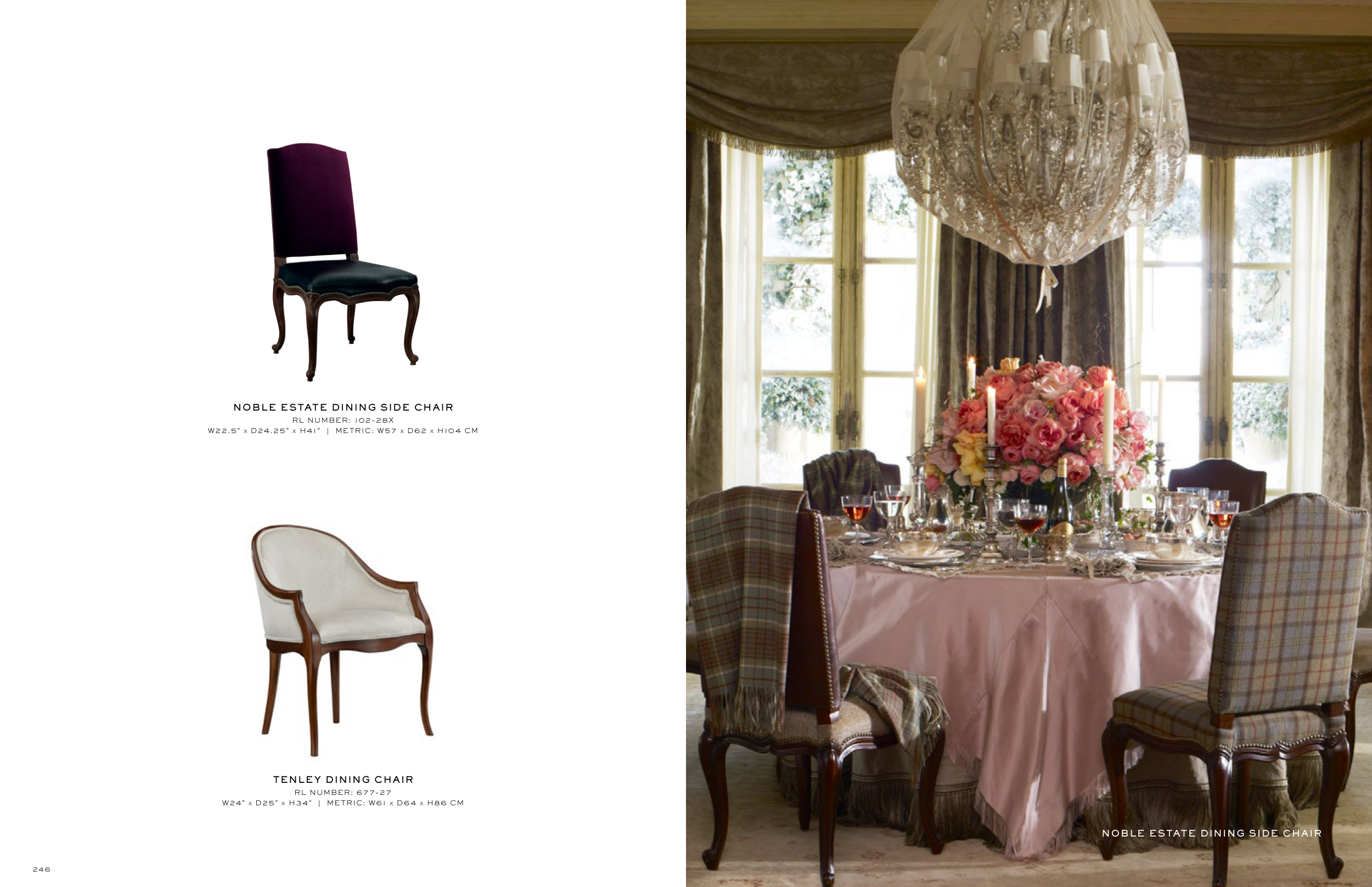 NOBLE ESTATE DINING SIDE CHAIR TENLEY DINING CHAIR RL NUMBER: 677-27 W24" x D25" x H34" | METRIC: W61 x D64 x H86 CM NOBLE ESTATE DINING SIDE CHAIR RL NUMBER: 102-28X W22.5" x D24.25" x H41" | METRIC: W57 x D62 x H104 CM 246