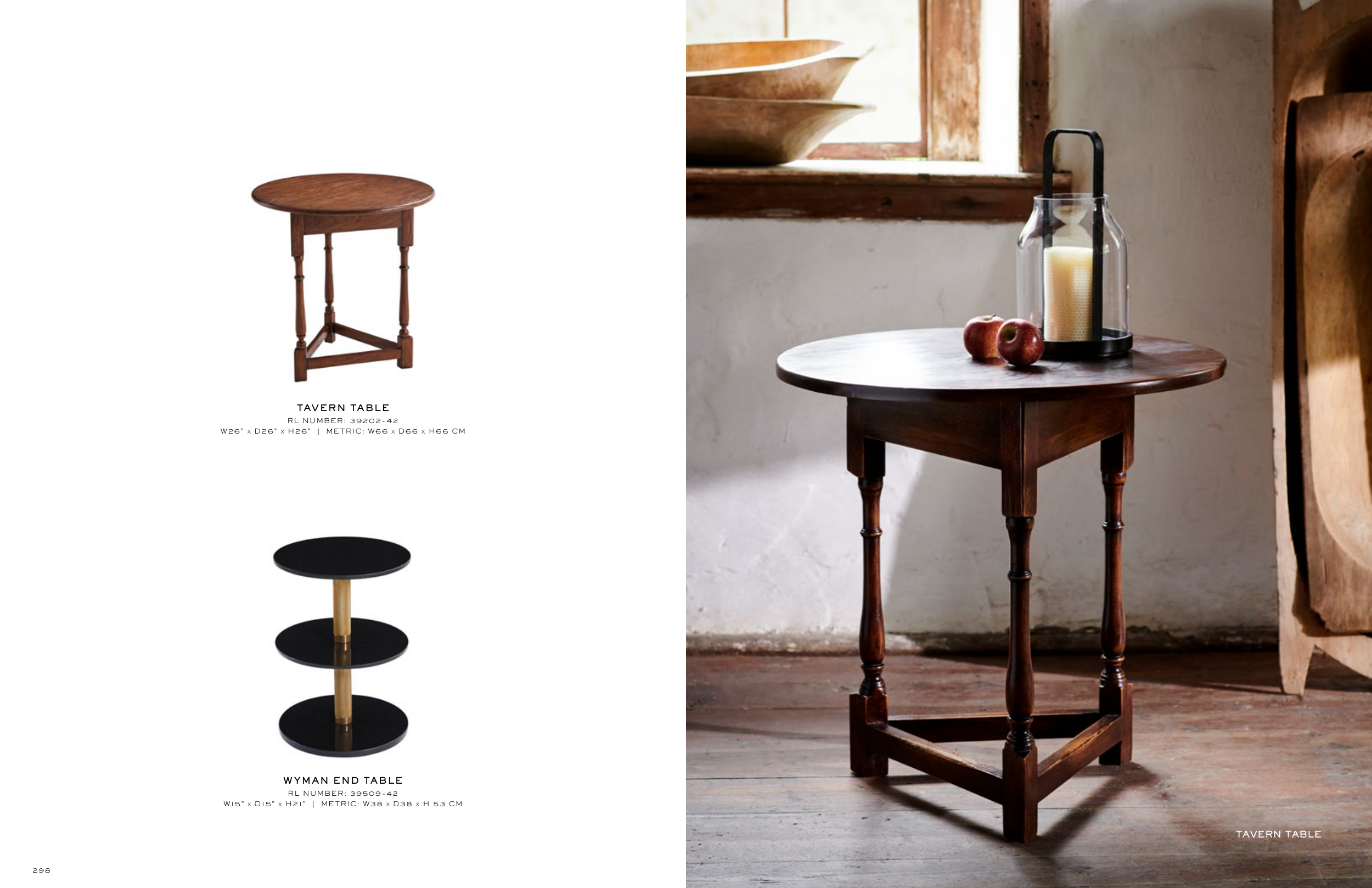 TAVERN TABLE TAVERN TABLE RL NUMBER: 39202-42 W26" x D26" x H26" | METRIC: W66 x D66 x H66 CM W YMAN END TABLE RL NUMBER: 39509-42 W15" x D15" x H21" | METRIC: W38 x D38 x H 53 CM 298