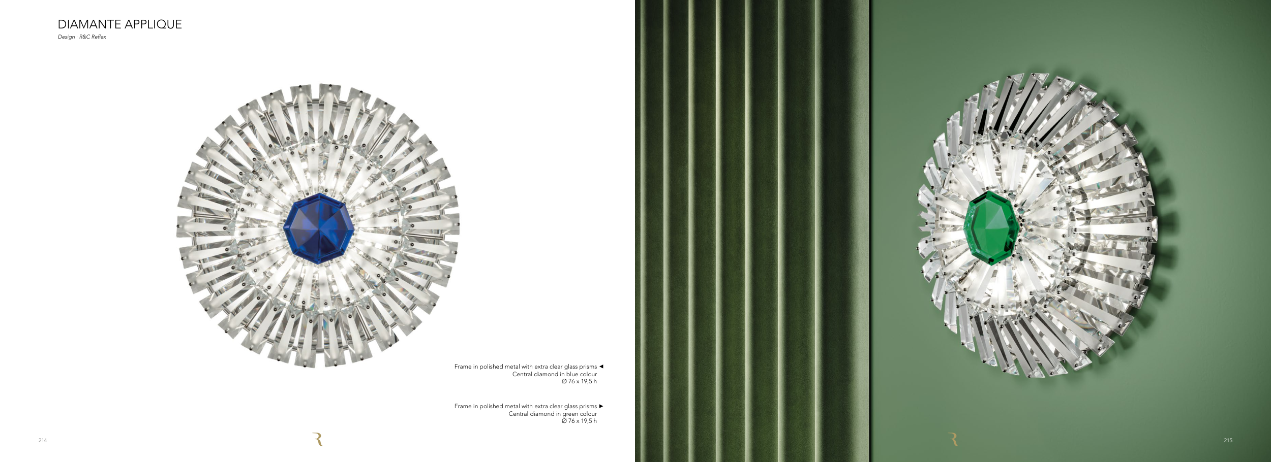 DIAMANTE APPLIQUE Design ∙ R&C Reflex Frame in polished metal with extra clear glass prisms Central diamond in green colour Ø 76 x 19,5 h Frame in polished metal with extra clear glass prisms Central diamond in blue colour Ø 76 x 19,5 h 215 214
