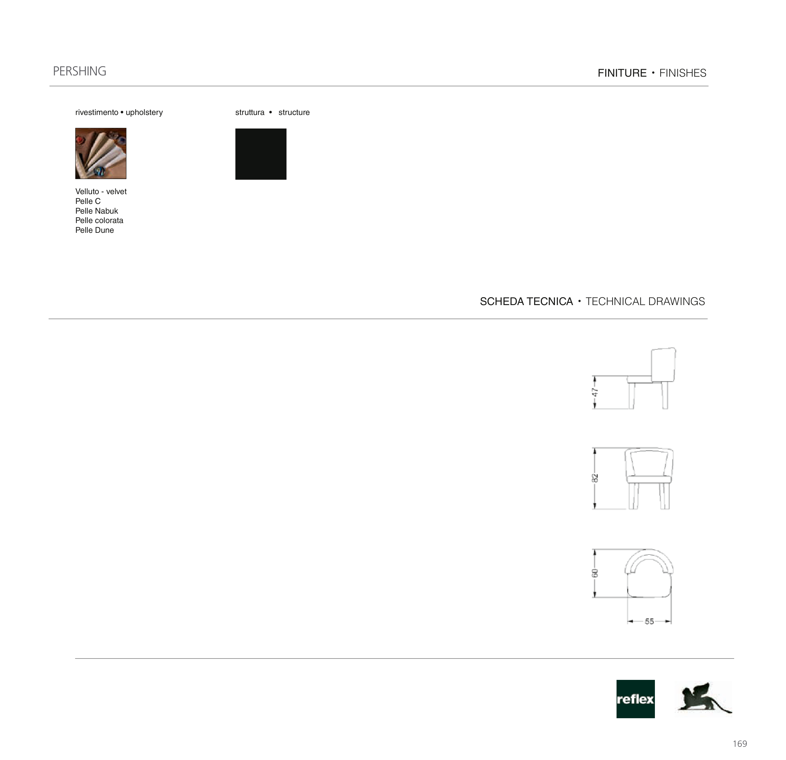 SCHEDA TECNICA • TECHNICAL DRAWINGS FINITURE • FINISHES struttura • structure PERSHING Velluto - velvet Pelle C Pelle Nabuk Pelle colorata Pelle Dune rivestimento • upholstery 169