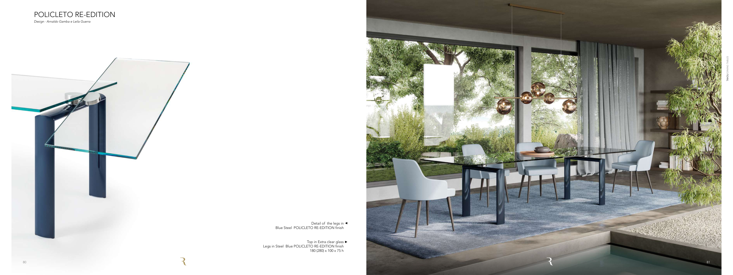 POLICLETO RE-EDITION Design ∙ Arnaldo Gamba e Leila Guerra Top in Extra clear glass Legs in Steel Blue POLICLETO RE-EDITION finish 180 (280) x 100 x 75 h Detail of the legs in Blue Steel POLICLETO RE-EDITION finish 81 TAVOLI DINING TABLES 80