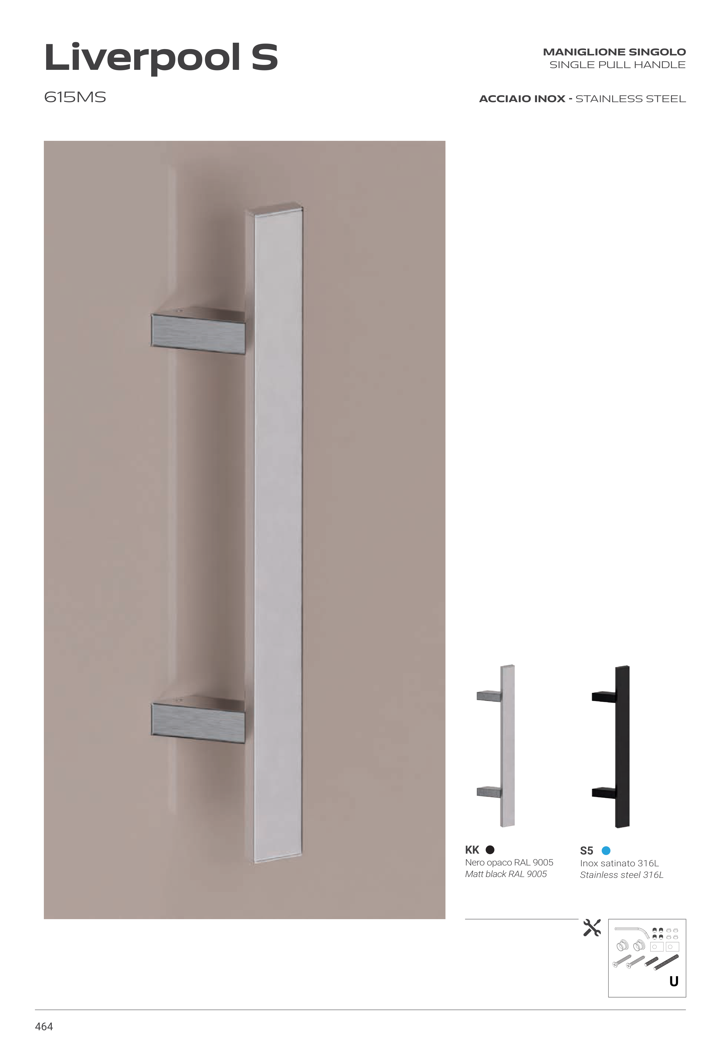 464 615MS Liverpool S ACCIAIO INOX - STAINLESS STEEL MANIGLIONE SINGOLO SINGLE PULL HANDLE U S5 Inox satinato 316L Stainless steel 316L KK Nero opaco RAL 9005 Matt black RAL 9005