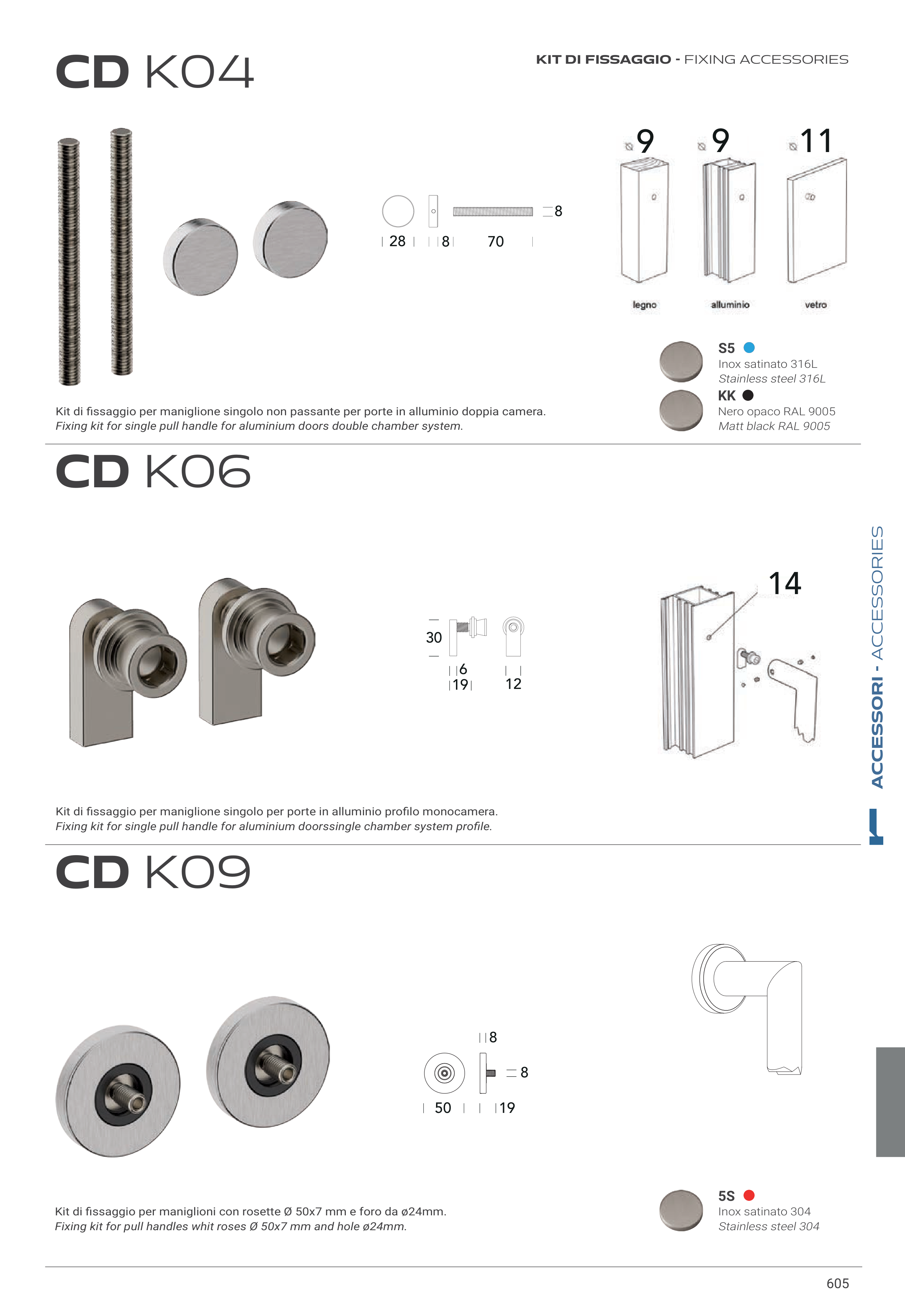 Fixing kit for single pull handle for aluminium doorssingle chamber system profile.