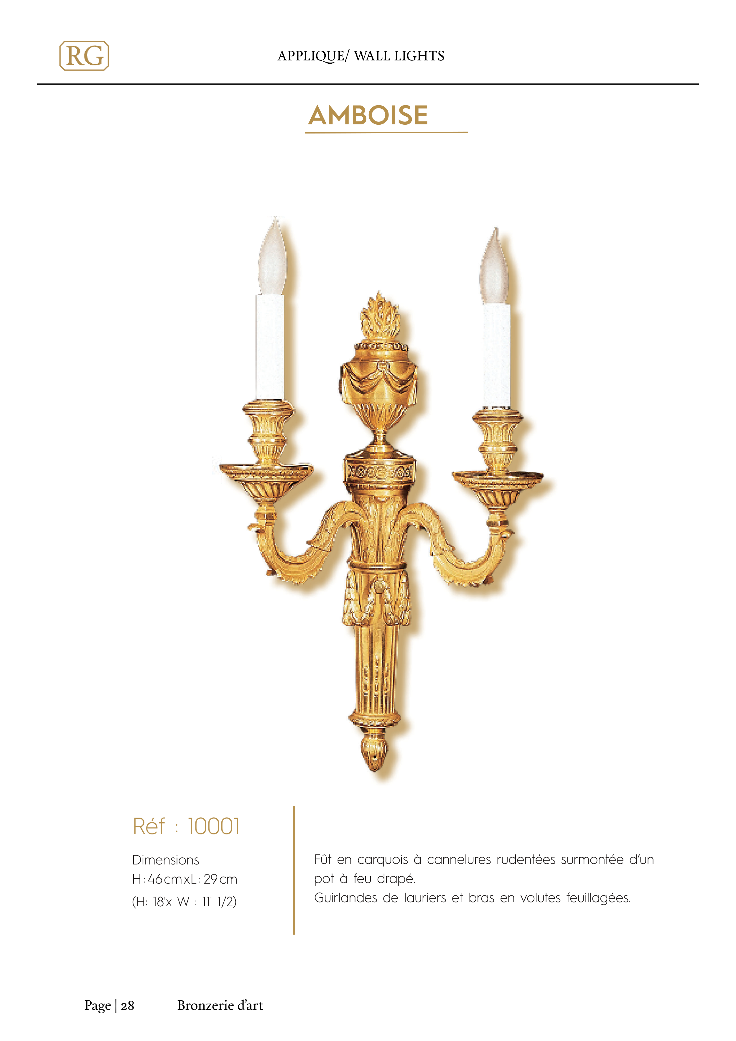 Bronzerie d’art Page | 28 APPLIQUE/ WALL LIGHTS Dimensions H : 46 cm xL : 29 cm (H: 18'x W : 11' 1/2) Réf : 10001 AMBOISE Fût en carquois à cannelures rudentées surmontée d’un pot à feu drapé. Guirlandes de lauriers et bras en volutes feuillagées.