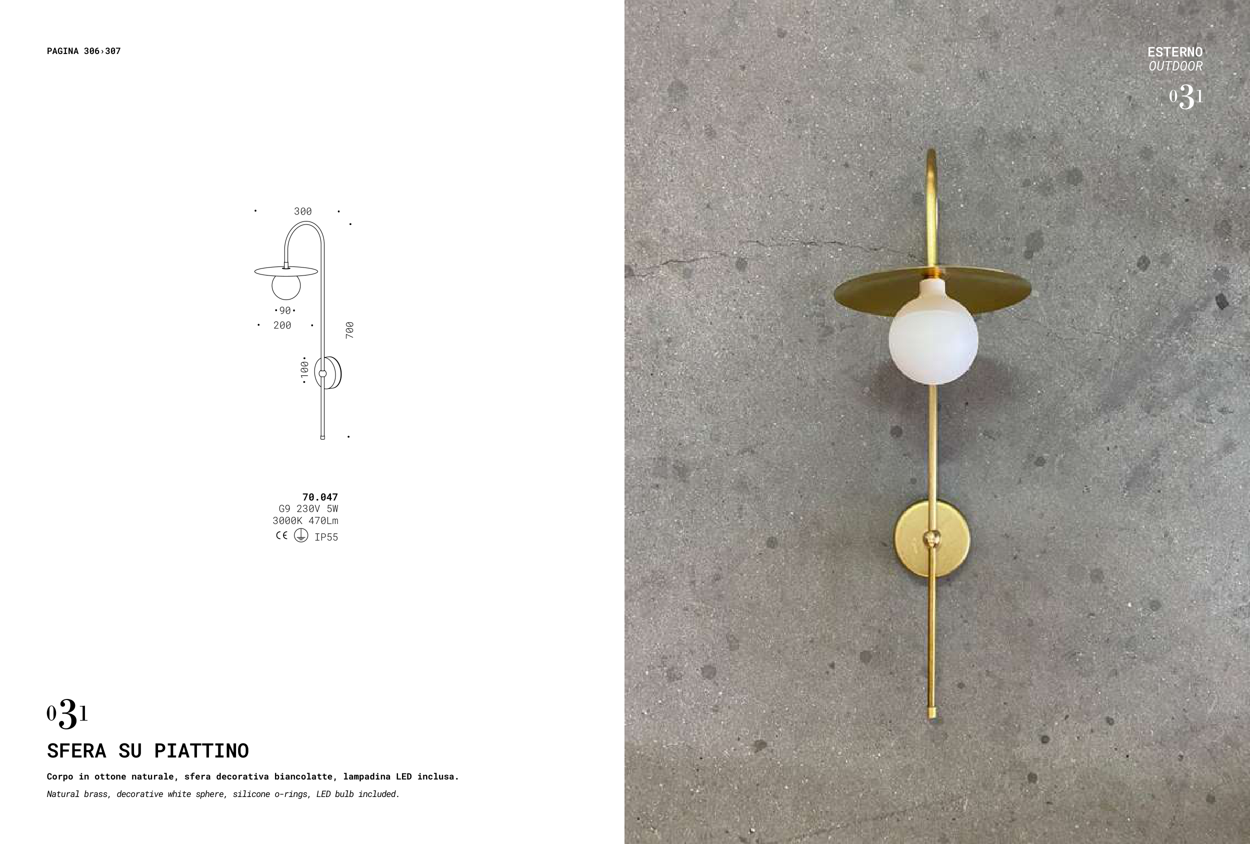 Natural brass, decorative white sphere, silicone o-rings, LED bulb included.