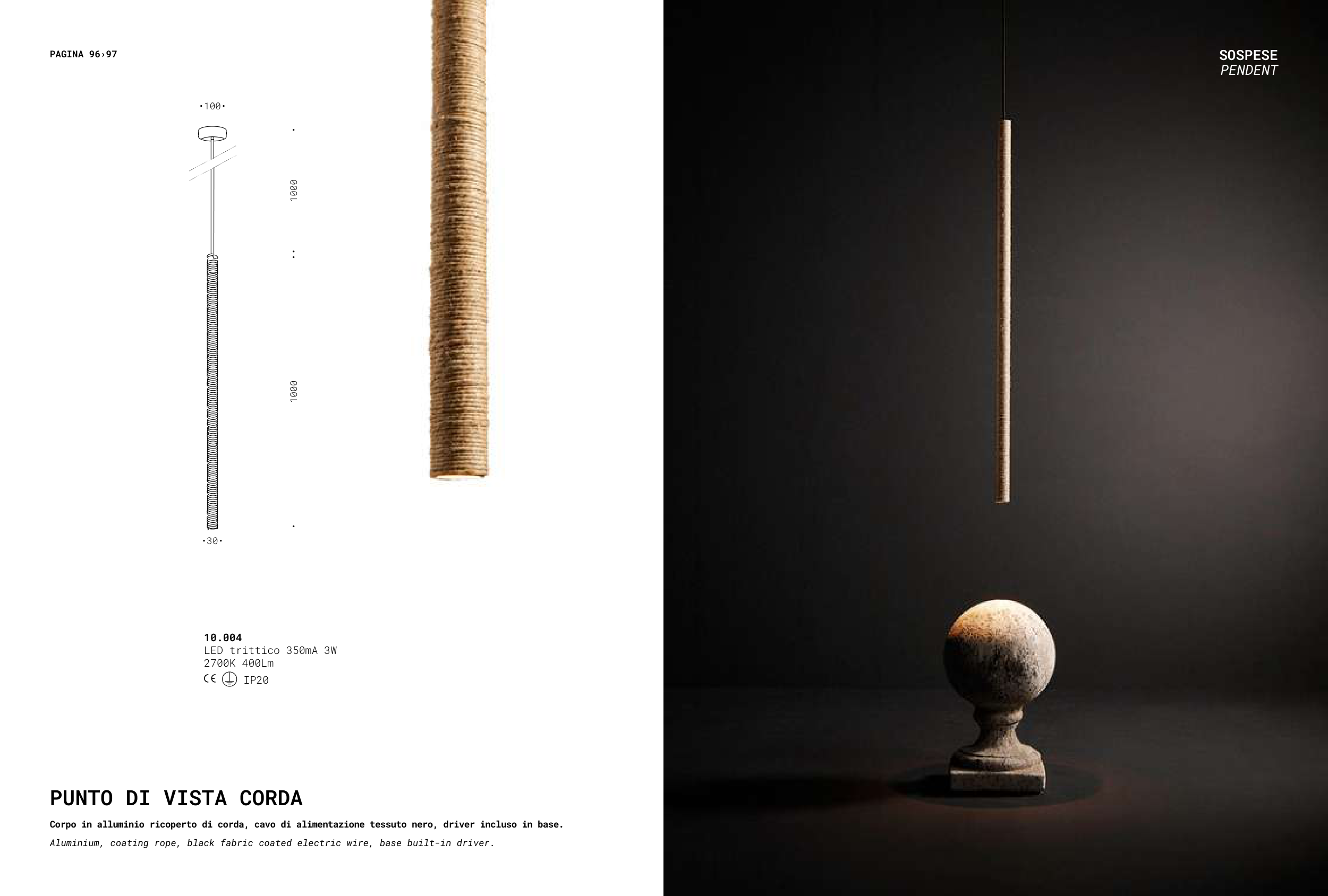 Corpo in alluminio ricoperto di corda, cavo di alimentazione tessuto nero, driver incluso in base.