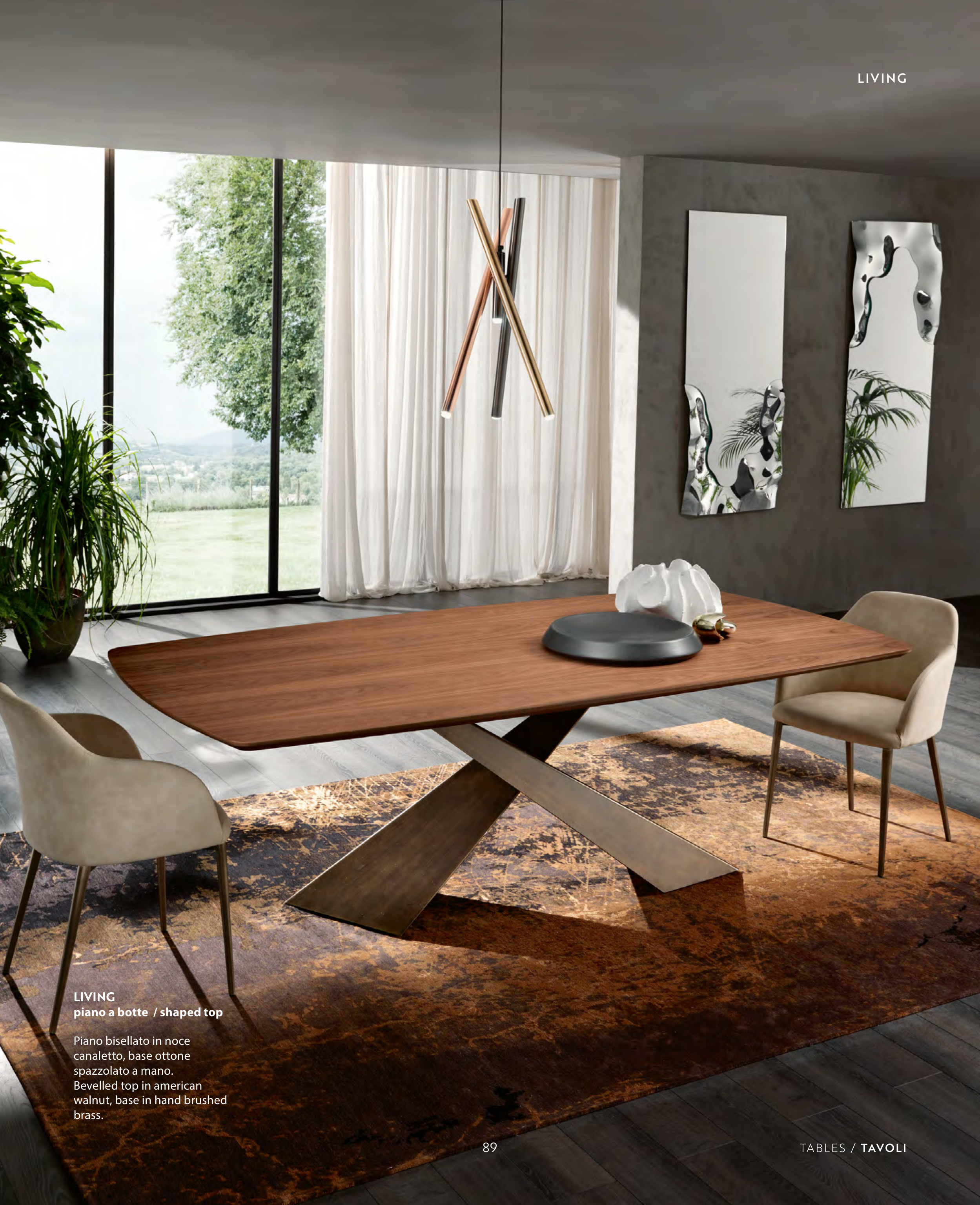 LIVING TABLES / TAVOLI LIVING piano a botte / shaped top Piano bisellato in noce canaletto, base ottone spazzolato a mano. Bevelled top in american walnut, base in hand brushed brass. 89