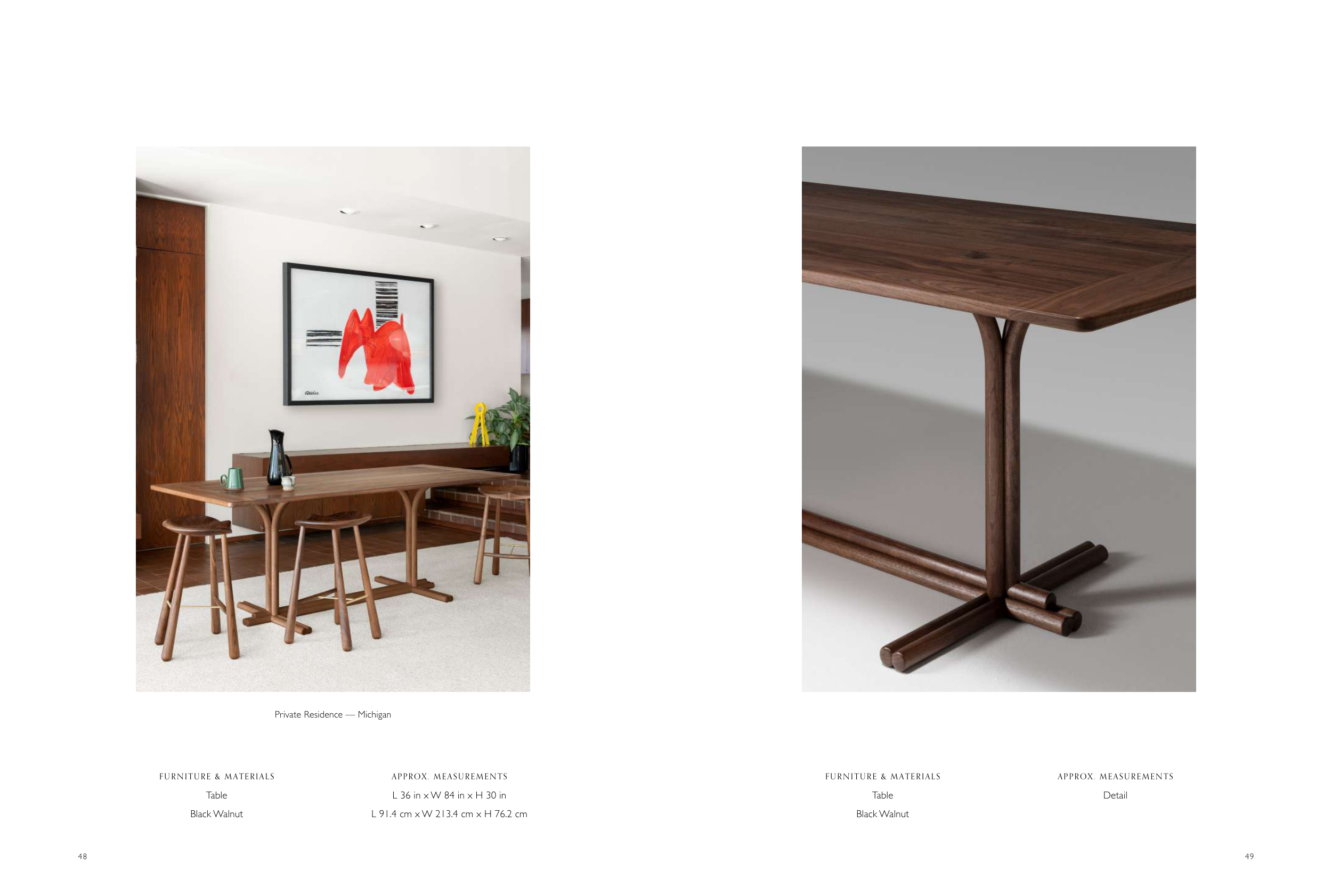 FURNITURE & MATERIALS Table Black Walnut APPROX. MEASUREMENTS L 36 in x W 84 in x H 30 in L 91.4 cm x W 213.4 cm x H 76.2 cm Private Residence — Michigan FURNITURE & MATERIALS Table Black Walnut APPROX. MEASUREMENTS Detail 49 48