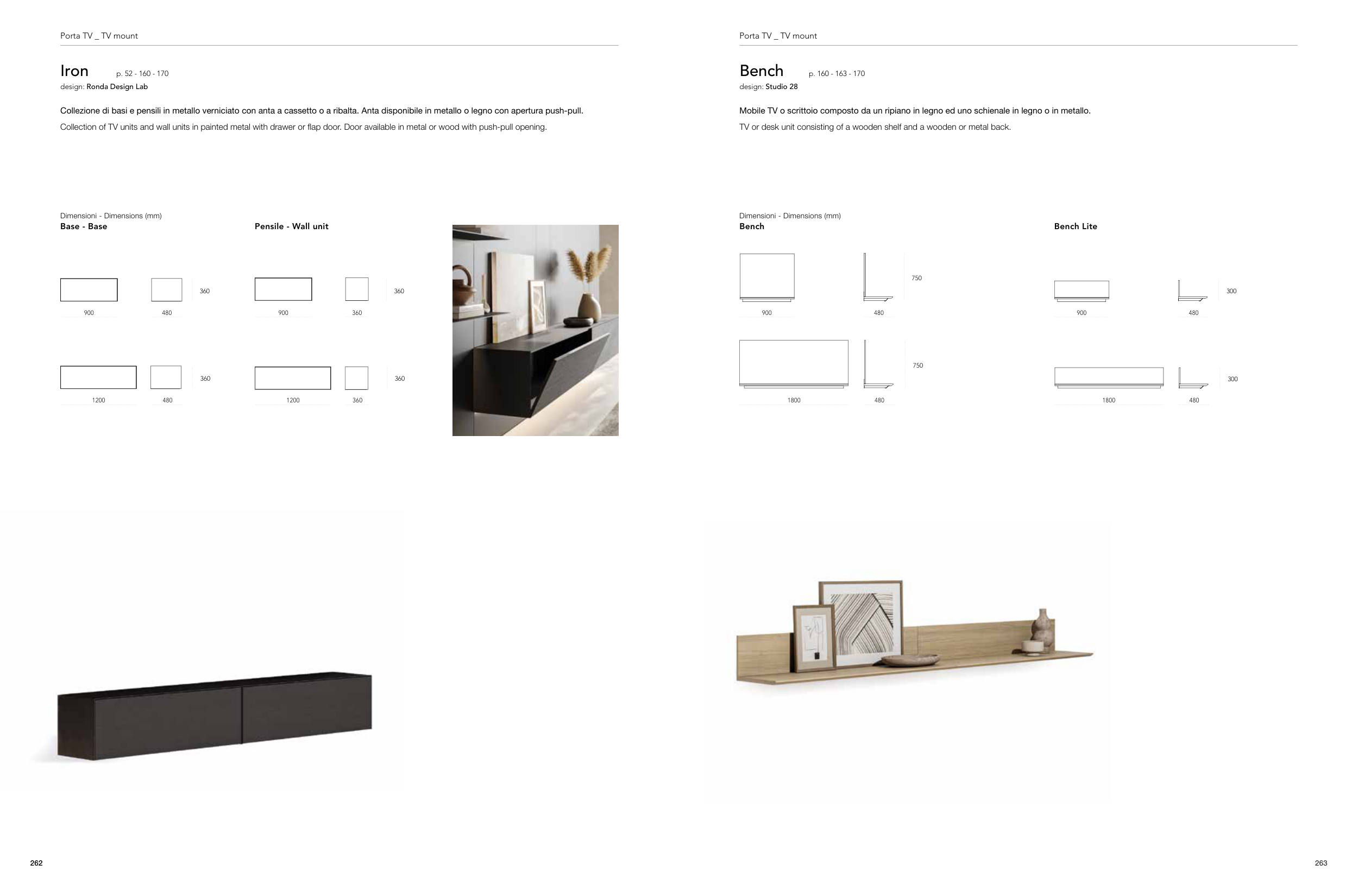 Collection of TV units and wall units in painted metal with drawer or flap door. Door available in metal or wood with push-pull opening.