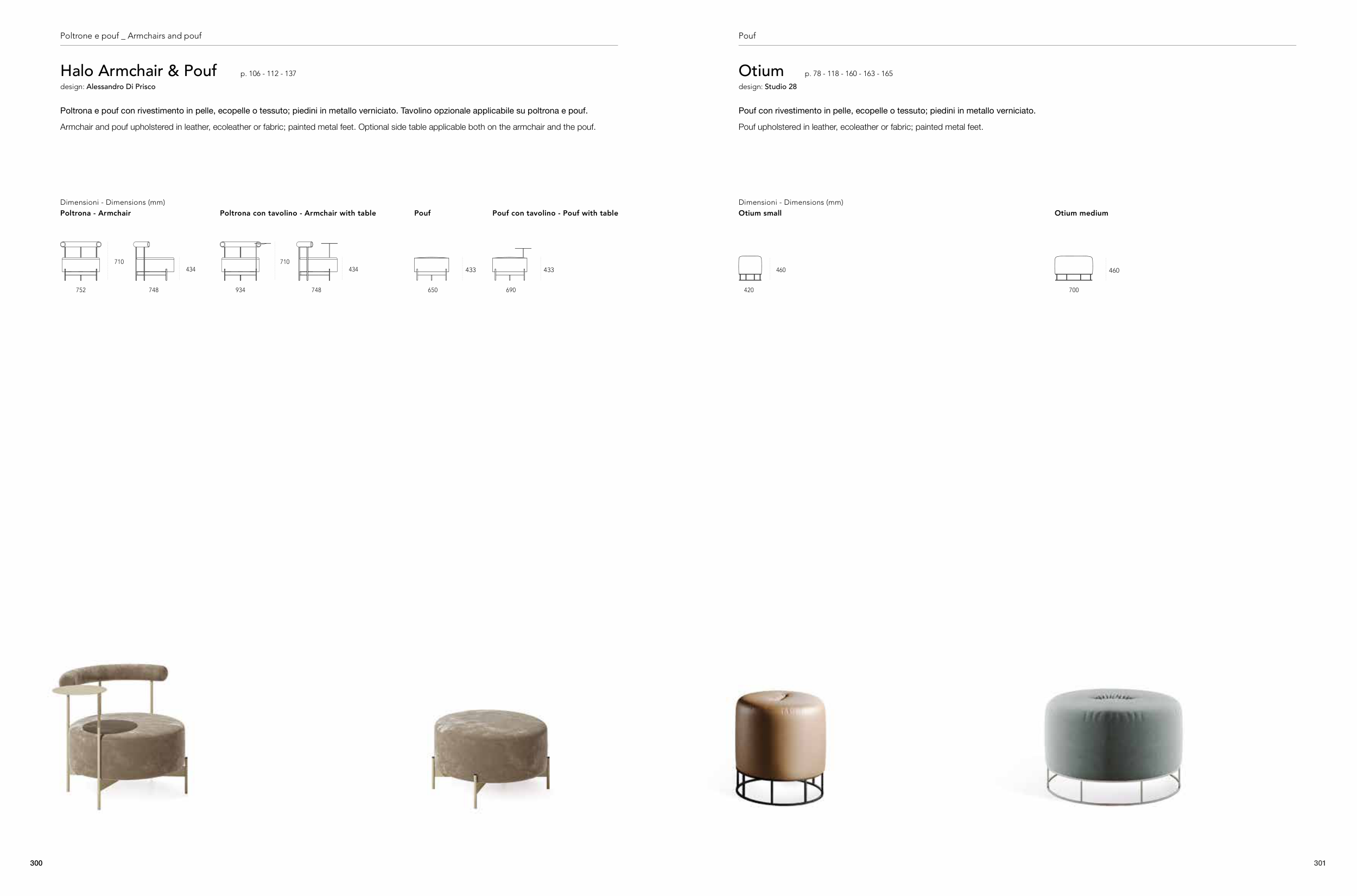 Armchair and pouf upholstered in leather, ecoleather or fabric; painted metal feet. Optional side table applicable both on the armchair and the pouf.