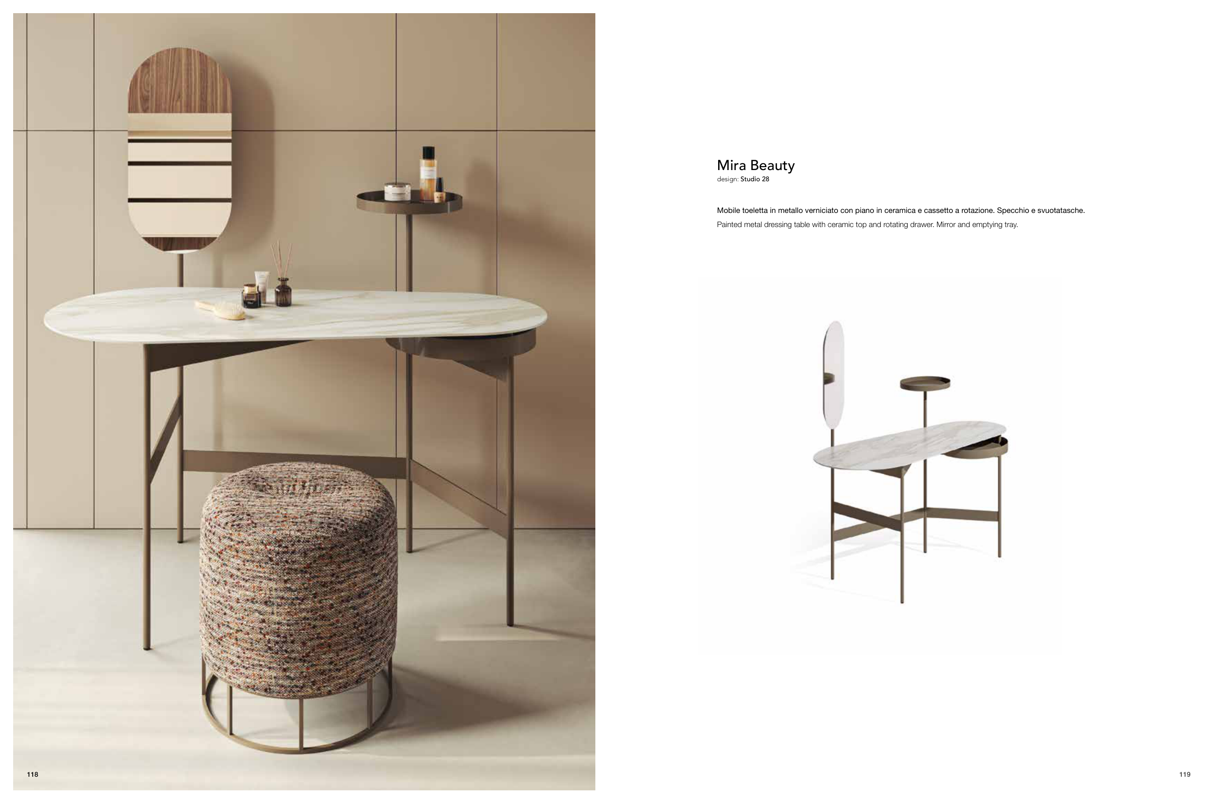 119 118 Mira Beauty design: Studio 28 Mobile toeletta in metallo verniciato con piano in ceramica e cassetto a rotazione. Specchio e svuotatasche. Painted metal dressing table with ceramic top and rotating drawer. Mirror and emptying tray.
