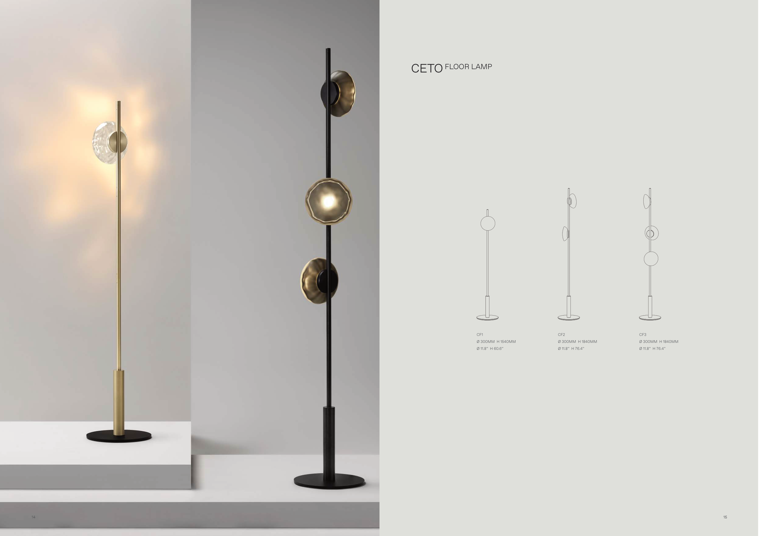 W ROSS GARDAM CETO COLLECTION CETO FLOOR LAMP CF1 Ø 300MM H 1540MM Ø 11.8” H 60.6” CF2 Ø 300MM H 1840MM Ø 11.8” H 76.4” CF3 Ø 300MM H 1840MM Ø 11.8” H 76.4” 14 15