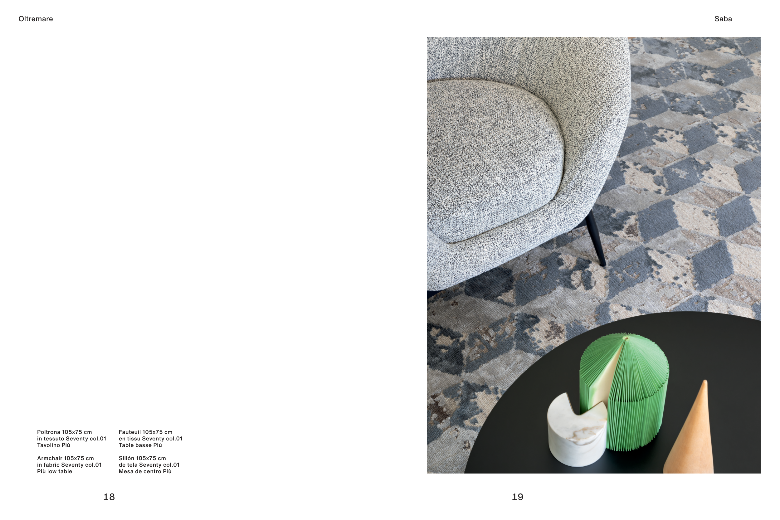 Oltremare Poltrona 105x75 cm in tessuto Seventy col.01 Tavolino Più Armchair 105x75 cm in fabric Seventy col.01 Più low table Fauteuil 105x75 cm en tissu Seventy col.01 Table basse Più Sillón 105x75 cm de tela Seventy col.01 Mesa de centro Più Saba 18 19