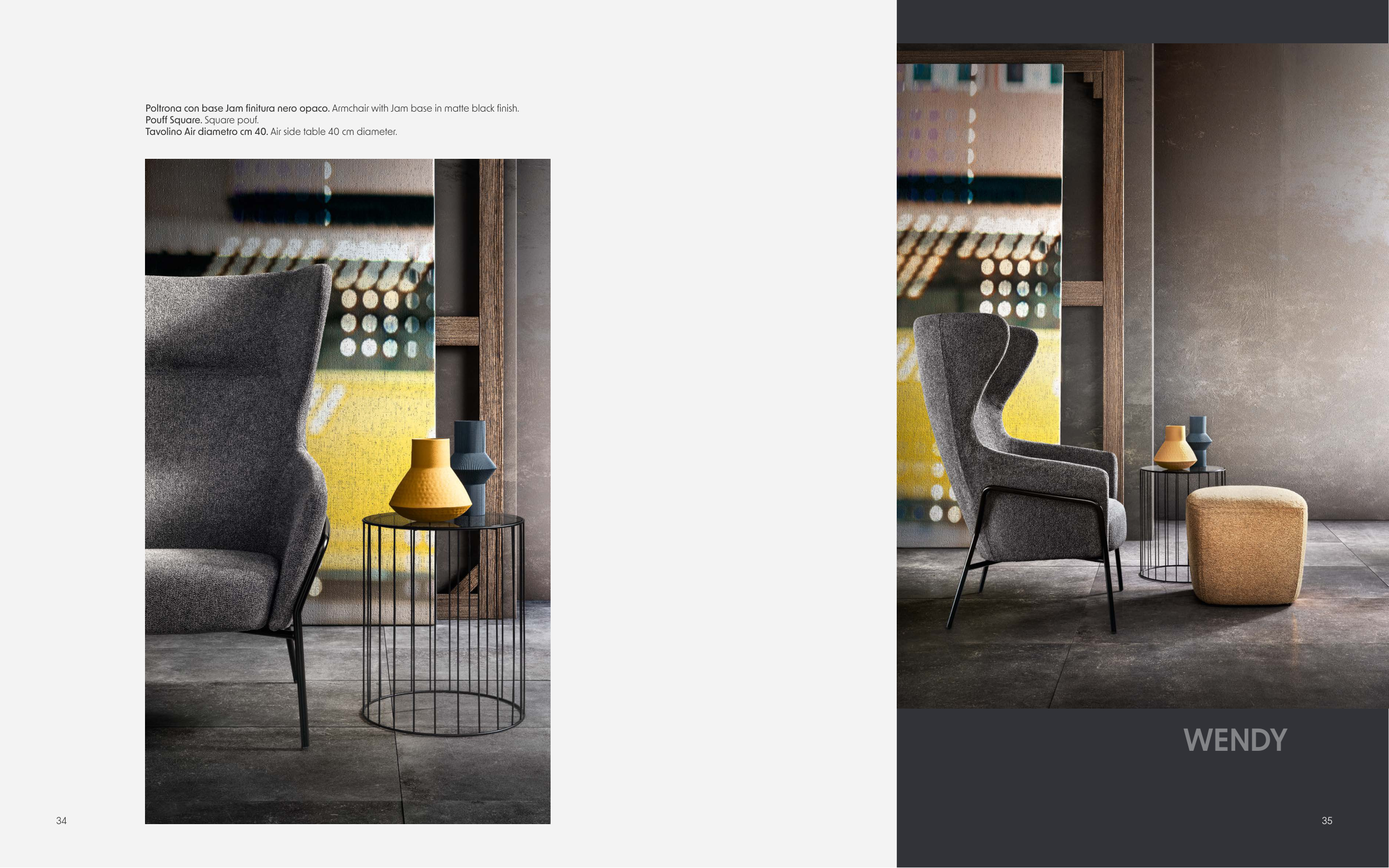 34 35 WENDY Poltrona con base Jam finitura nero opaco. Armchair with Jam base in matte black finish. Pouff Square. Square pouf. Tavolino Air diametro cm 40. Air side table 40 cm diameter.