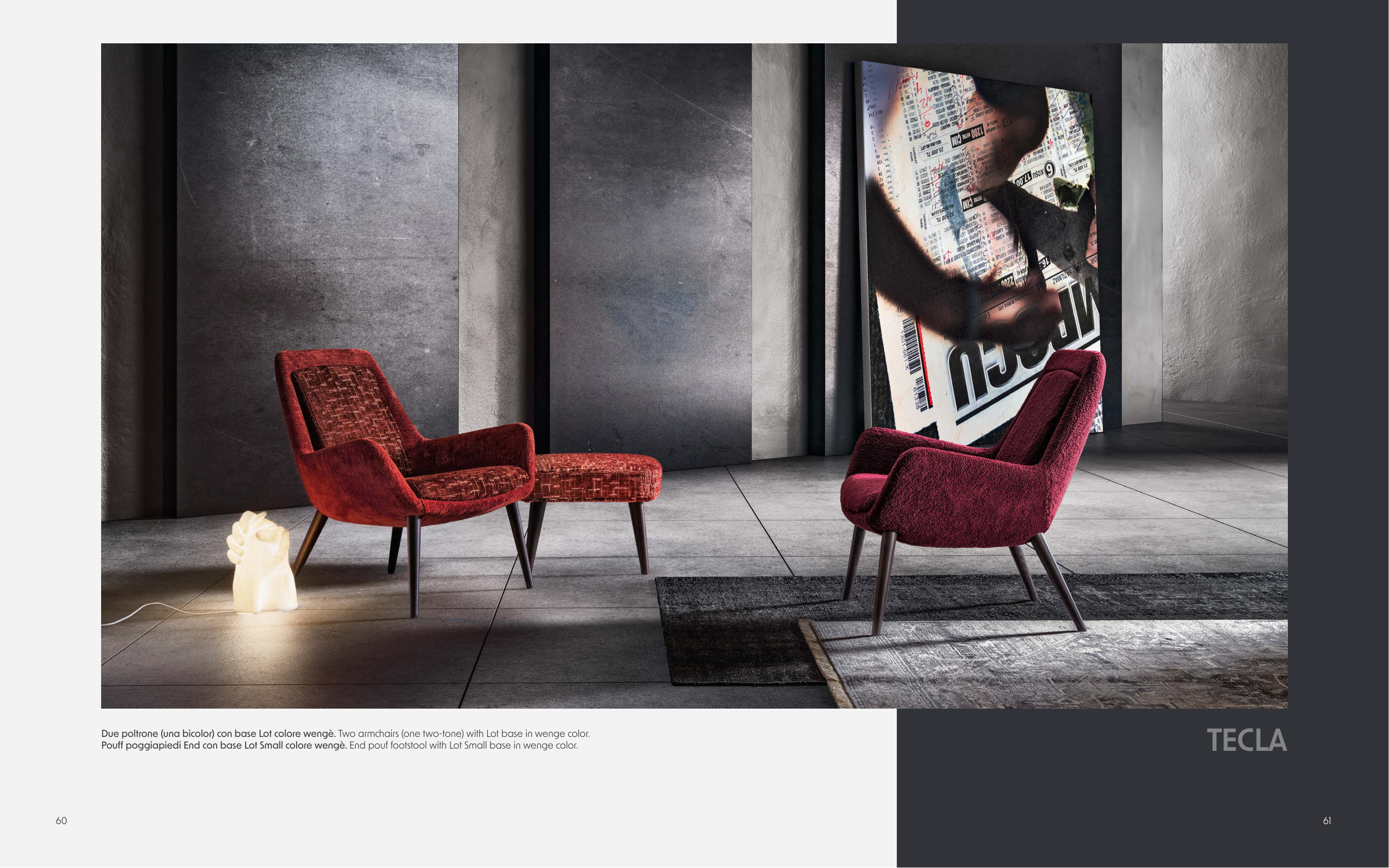 60 Due poltrone (una bicolor) con base Lot colore wengè. Two armchairs (one two-tone) with Lot base in wenge color. Pouff poggiapiedi End con base Lot Small colore wengè. End pouf footstool with Lot Small base in wenge color. 61 TECLA