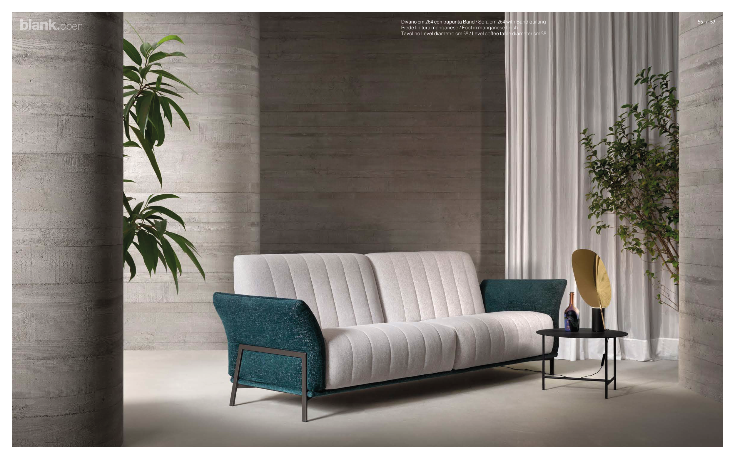 56 / 57 Divano cm 264 con trapunta Band / Sofa cm 264 with Band quilting Piede finitura manganese / Foot in manganese finish Tavolino Level diametro cm 58 / Level coffee table diameter cm 58 blank.open