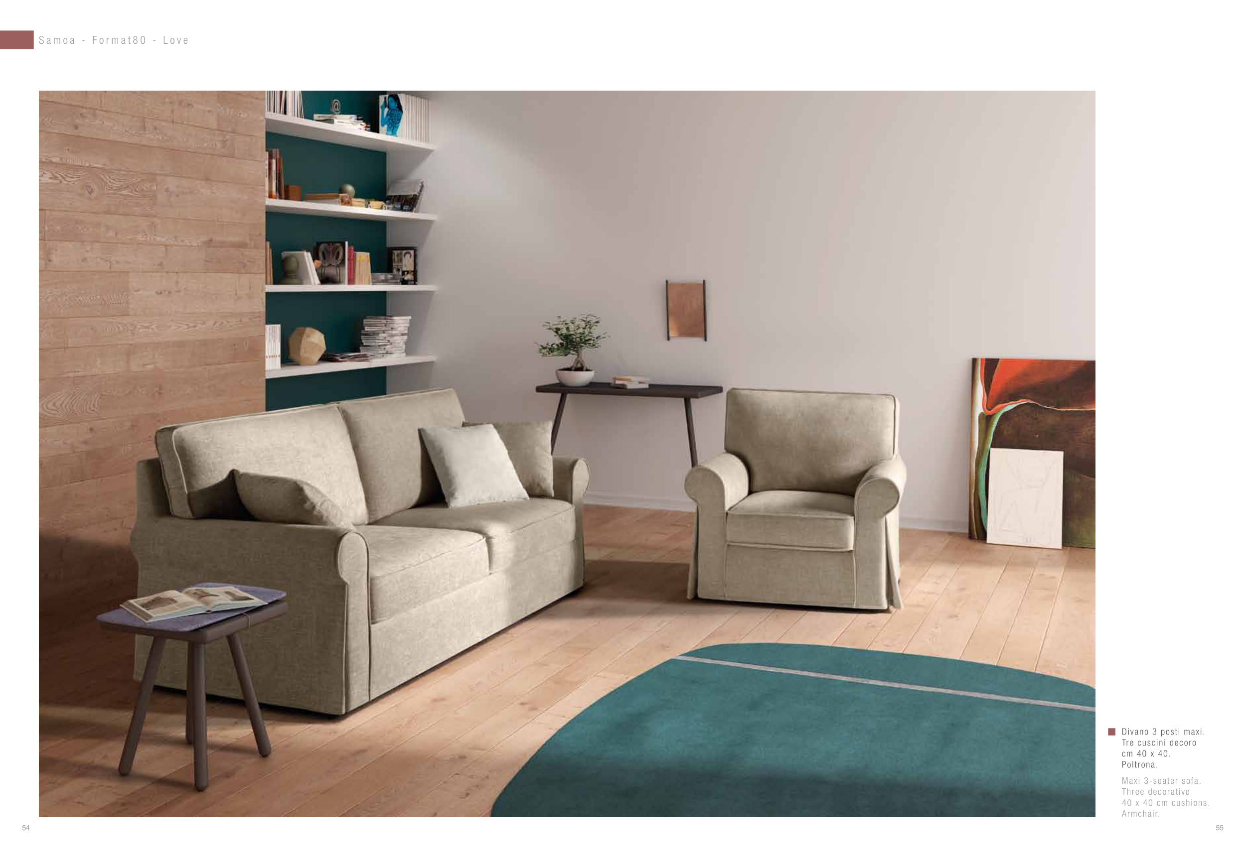 Divano 3 posti maxi. Tre cuscini decoro cm 40 x 40. Poltrona. Maxi 3-seater sofa. Three decorative 40 x 40 cm cushions. Armchair. S a m o a - F o r m a t 8 0 - L o v e 54 55