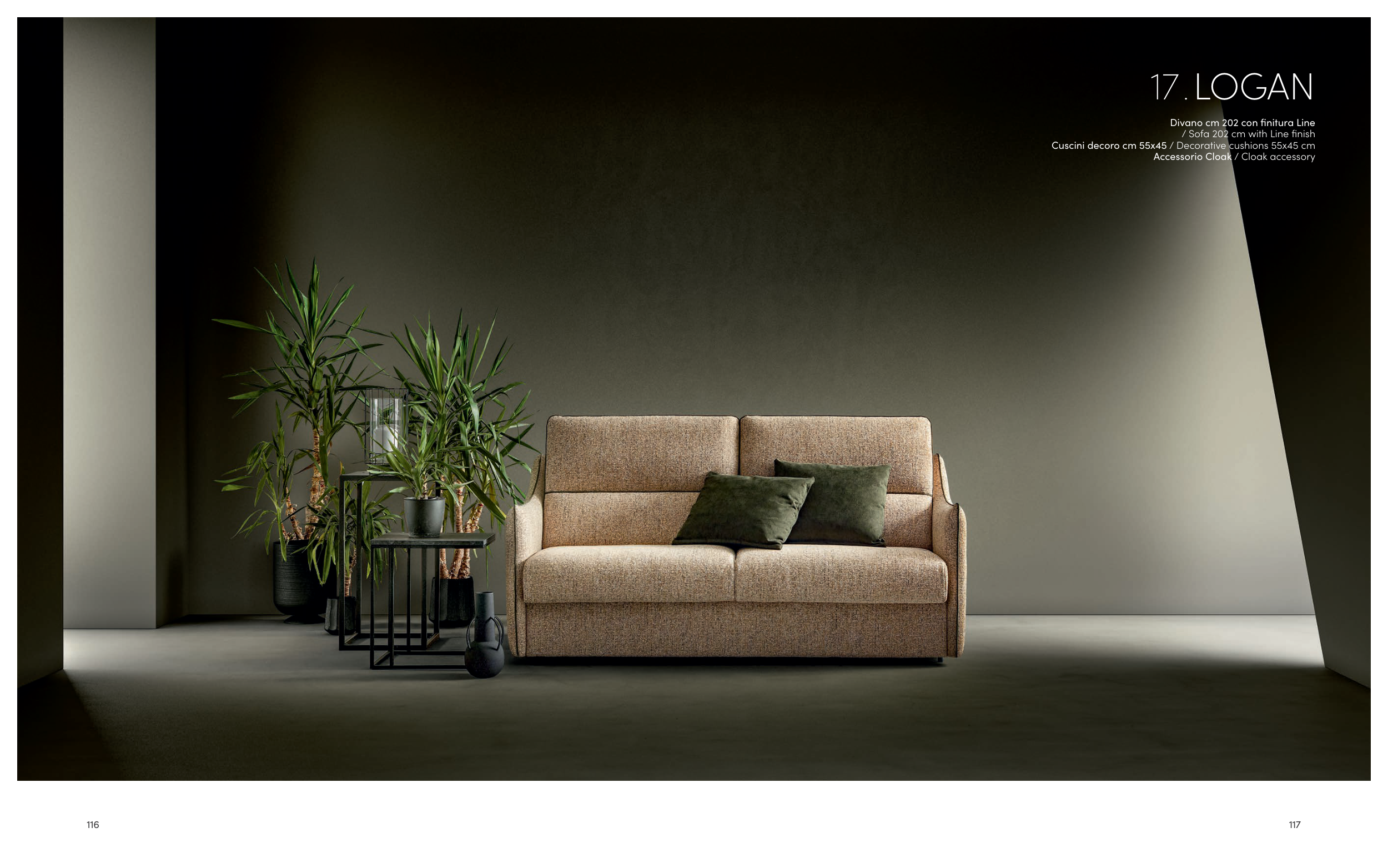 116 METAMORFOSI.indd 116 15/09/25 12:15 117 17 .LOGAN Divano cm 202 con finitura Line / Sofa 202 cm with Line finish Cuscini decoro cm 55x45 / Decorative cushions 55x45 cm Accessorio Cloak / Cloak accessory METAMORFOSI.indd 117 15/09/25 12:15