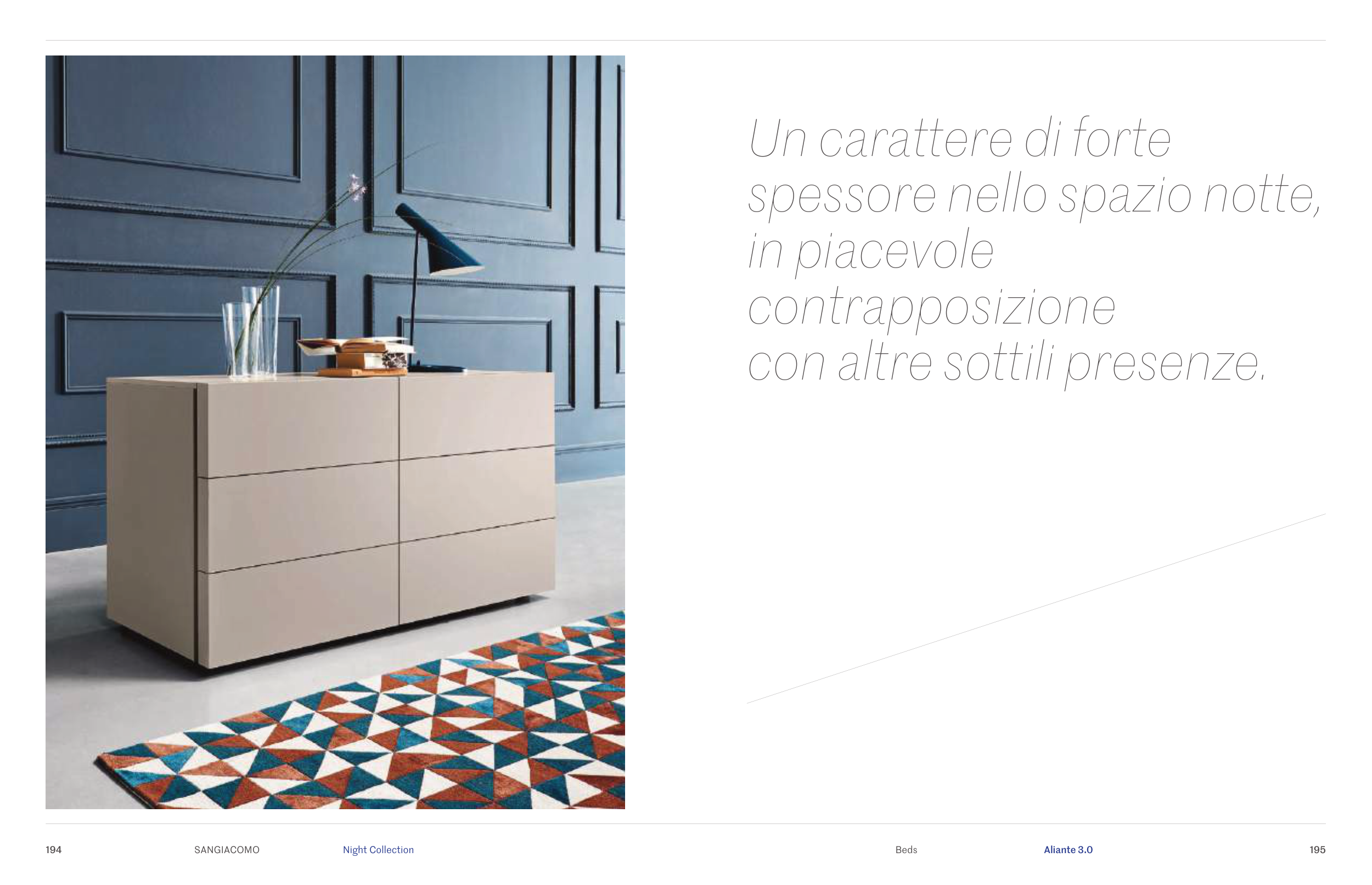 SANGIACOMO 194 195 Night Collection Beds Aliante 3.0 Un carattere di forte spessore nello spazio notte, in piacevole contrapposizione con altre sottili presenze.