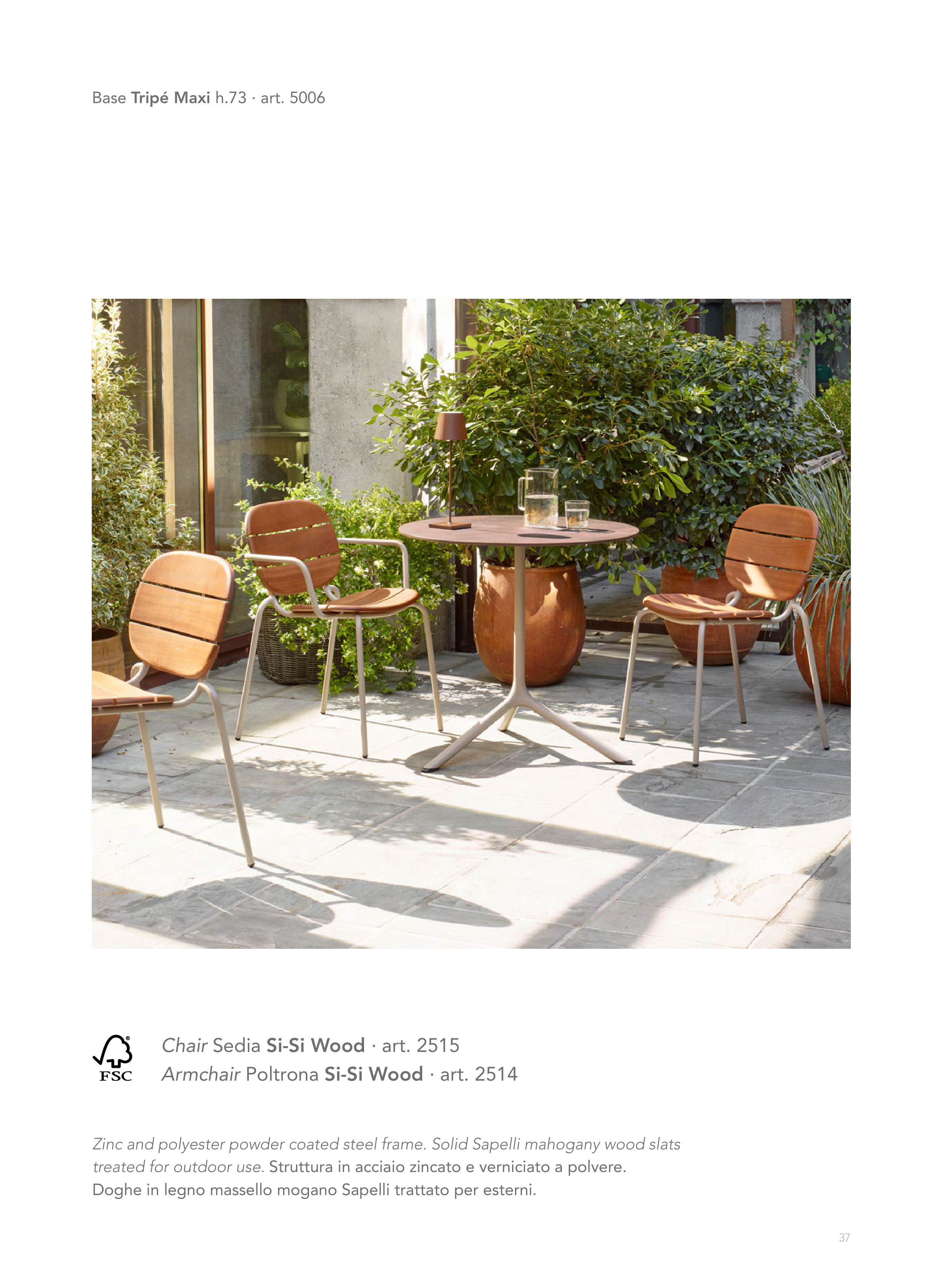 Zinc and polyester powder coated steel frame. Solid Sapelli mahogany wood slats