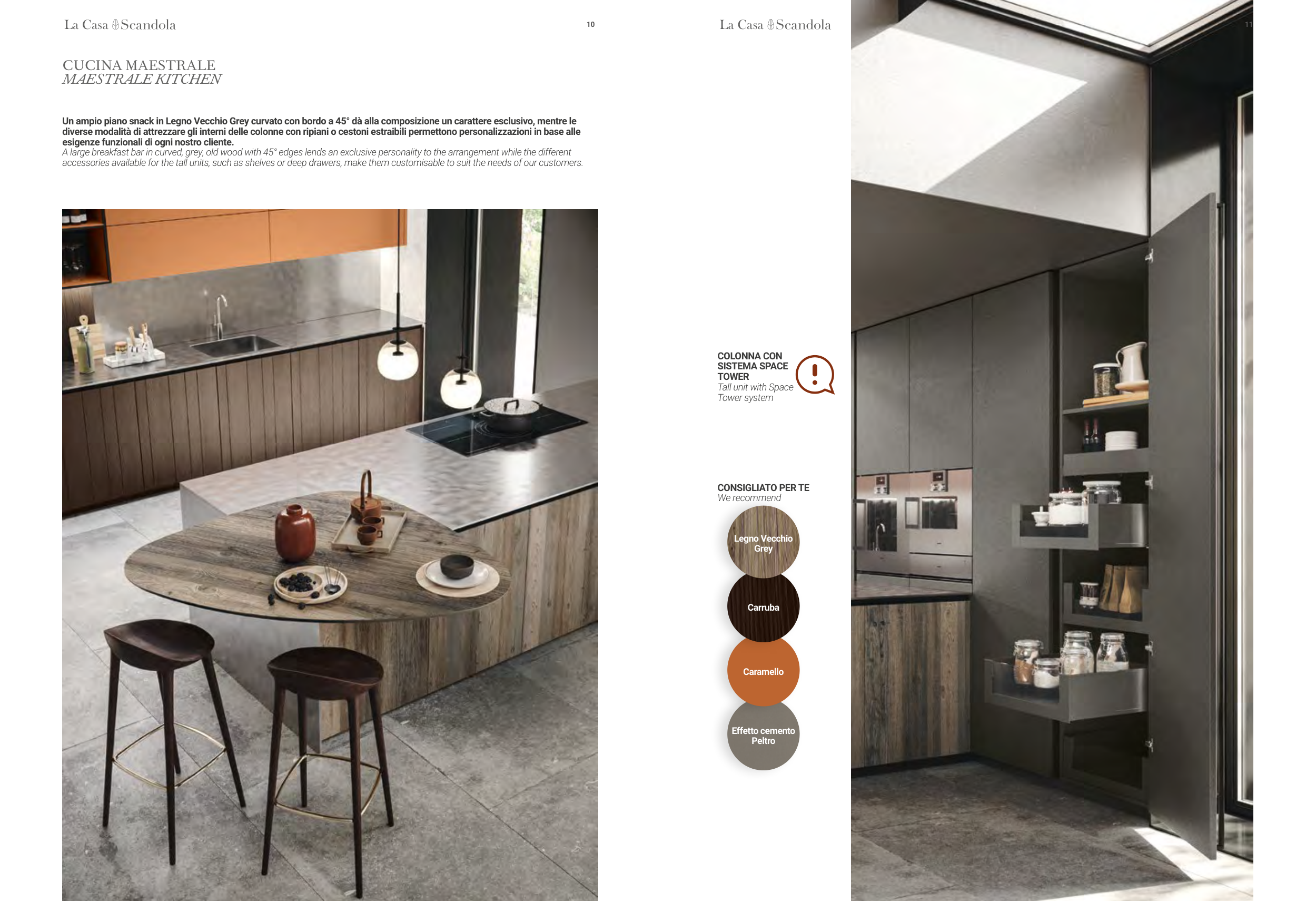Un ampio piano snack in Legno Vecchio Grey curvato con bordo a 45° dà alla composizione un carattere esclusivo, mentre le