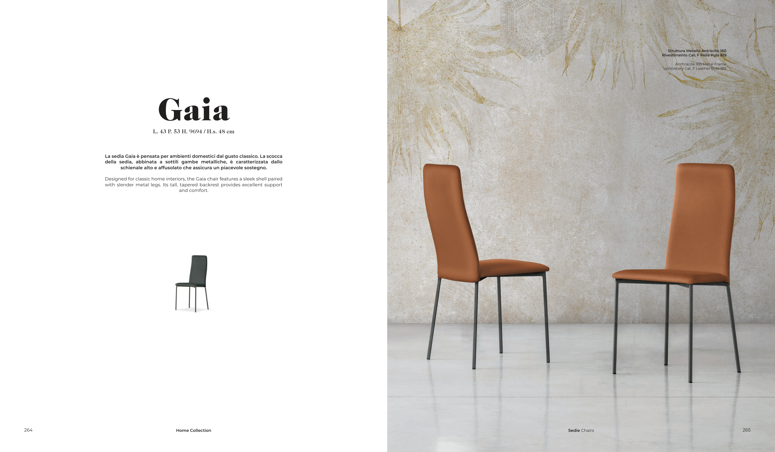 Designed for classic home interiors, the Gaia chair features a sleek shell paired