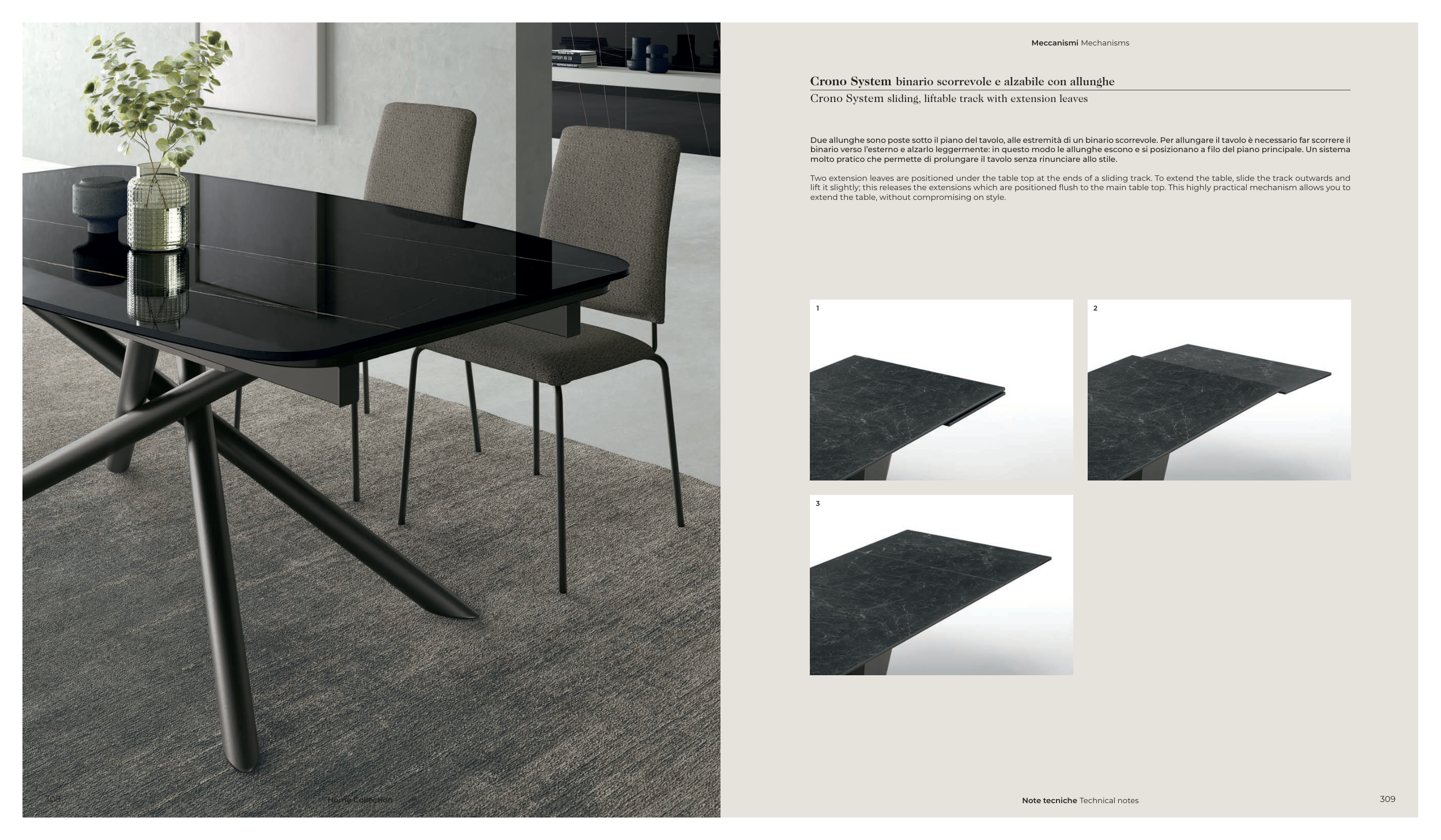 lift it slightly; this releases the extensions which are positioned flush to the main table top. This highly practical mechanism allows you to