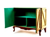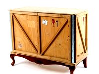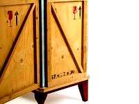 A line of furniture in wood and metal characterized by a structure consciously attributed to the shipping crates, decorated with stickers and classical transport stamps and intentionally worn. They are embellished with baroque legs.