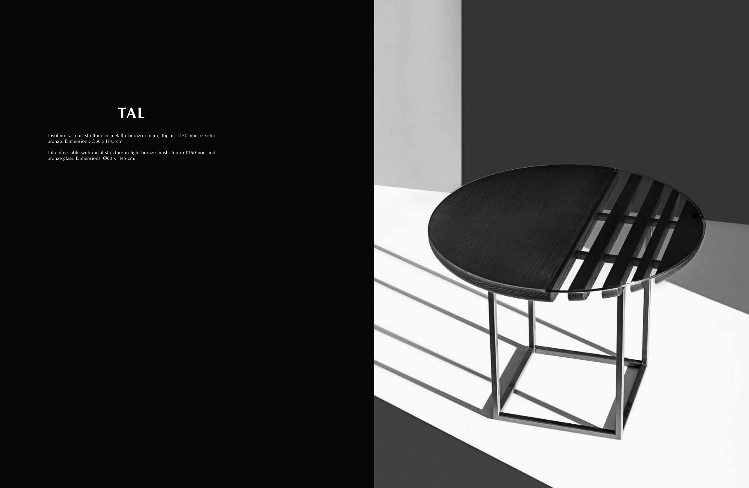 15 Tavolino Tal con struttura in metallo bronzo chiaro, top in T150 noir e vetro bronzo. Dimensioni: Ø60 x H45 cm. Tal coffee table with metal structure in light bronze finish, top in T150 noir and bronze glass. Dimensions: Ø60 x H45 cm. TAL