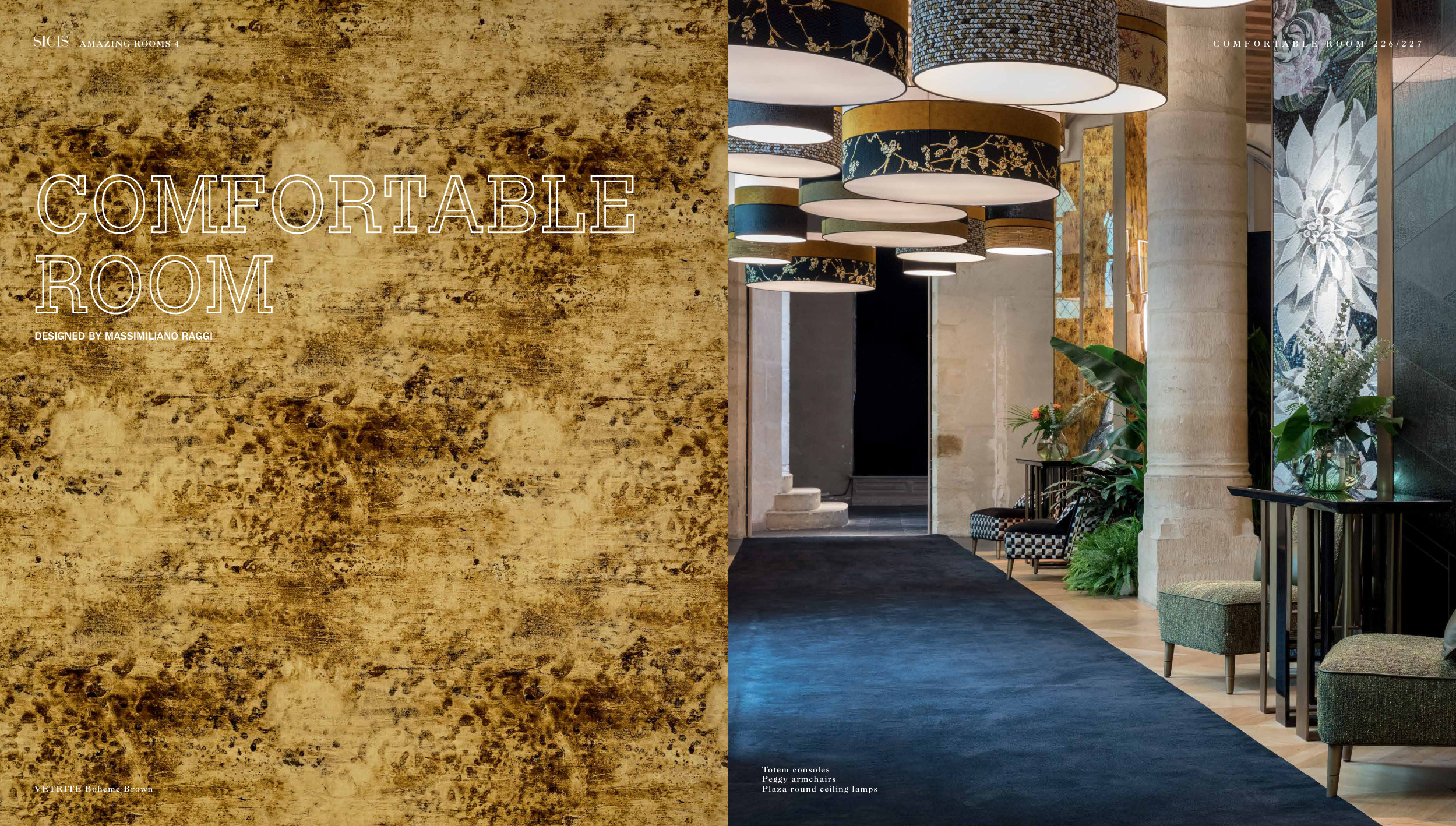 Totem consoles Peggy armchairs Plaza round ceiling lamps VETRITE Boheme Brown DESIGNED BY MASSIMILIANO RAGGI 2 2 6 / 2 2 7 C O M F O R T A B L E R O O M AMAZING ROOMS 4