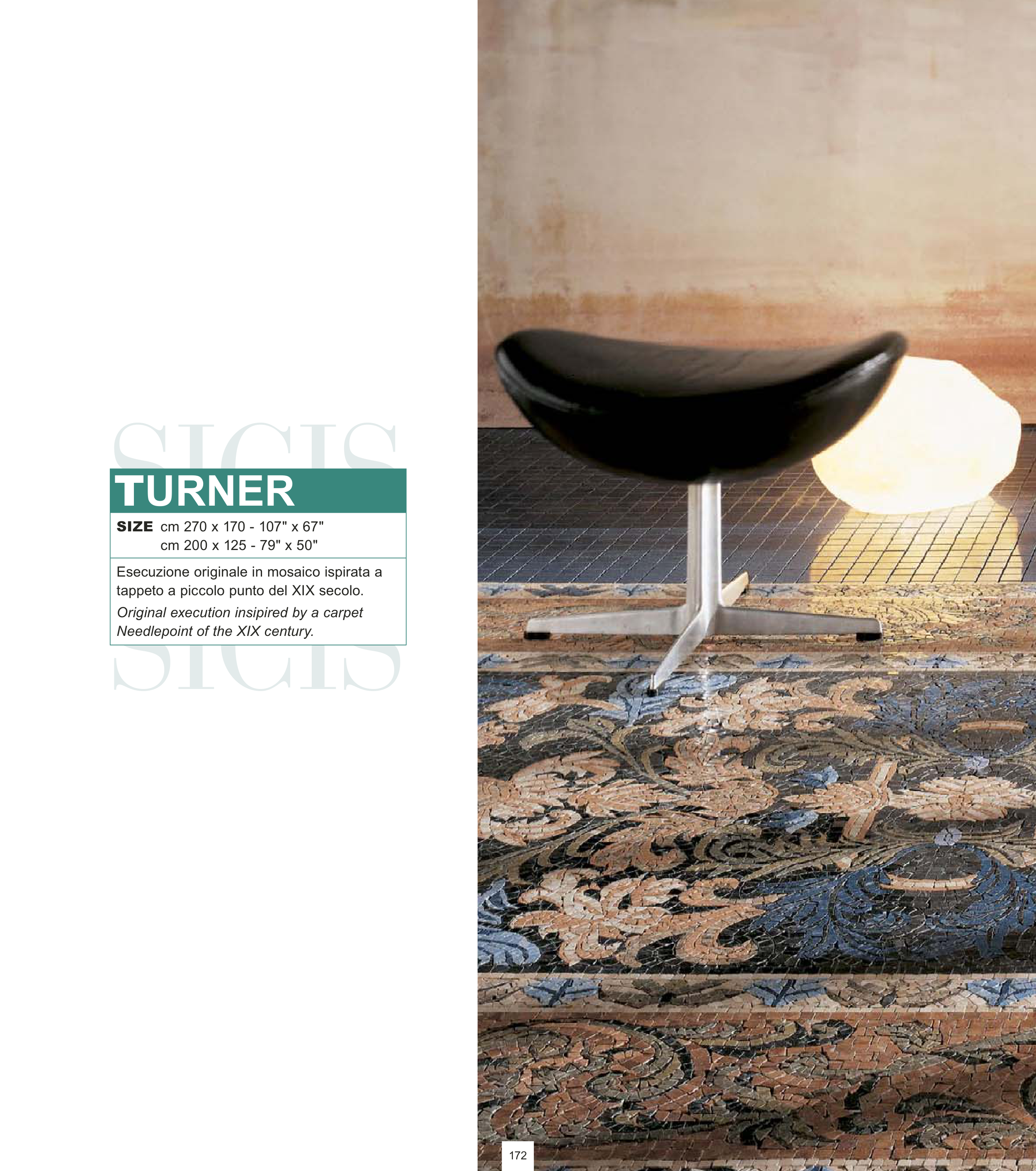 Esecuzione originale in mosaico ispirata a tappeto a piccolo punto del XIX secolo. Original execution insipired by a carpet Needlepoint of the XIX century. TURNER 172